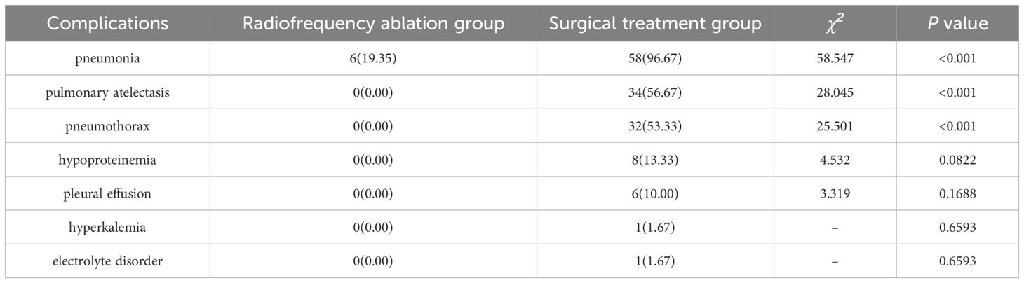 Postoperatively, six children (19.35%) in the radiofrequency ablation group developed pneumonia, a singular complication in this cohort. Conversely, the surgical treatment group saw postoperative complications in 58 cases (96.67%), with 45 patients (75.00%) experiencing multiple complications. These included 58 instances of pneumonia, 34 of pulmonary atelectasis, 32 of pneumothorax (9 cases of hemopneumothorax and 23 of liquid pneumothorax), 8 cases of hypoproteinemia, 6 cases of pleural effusion, 1 case of hyperkalemia, and 1 case of electrolyte imbalance. Notably, the rates of pneumonia, pulmonary atelectasis, and pneumothorax presented significant statistical differences between the groups (P < 0.05), as detailed in Table 3.