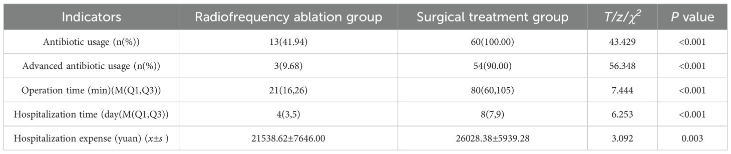 Antibiotics use was observed in all 60 cases (100.00%) in the surgical treatment group, compared to only 13 cases (41.94%) in the radiofrequency ablation group, showcasing a significant difference in antibiotic utilization rates between the two groups (χ2 = 43.4291, P < 0.001). This indicates a substantially lower rate of antibiotic use in the radiofrequency ablation group. Moreover, high-level antibiotics were administered in just 3 cases (9.68%) in the radiofrequency ablation group and 54 cases (90.00%) in the surgical treatment group, further emphasizing the lower usage of high-level antibiotics in the radiofrequency ablation group (χ2 = 56.3477, P < 0.001) (Table 4).