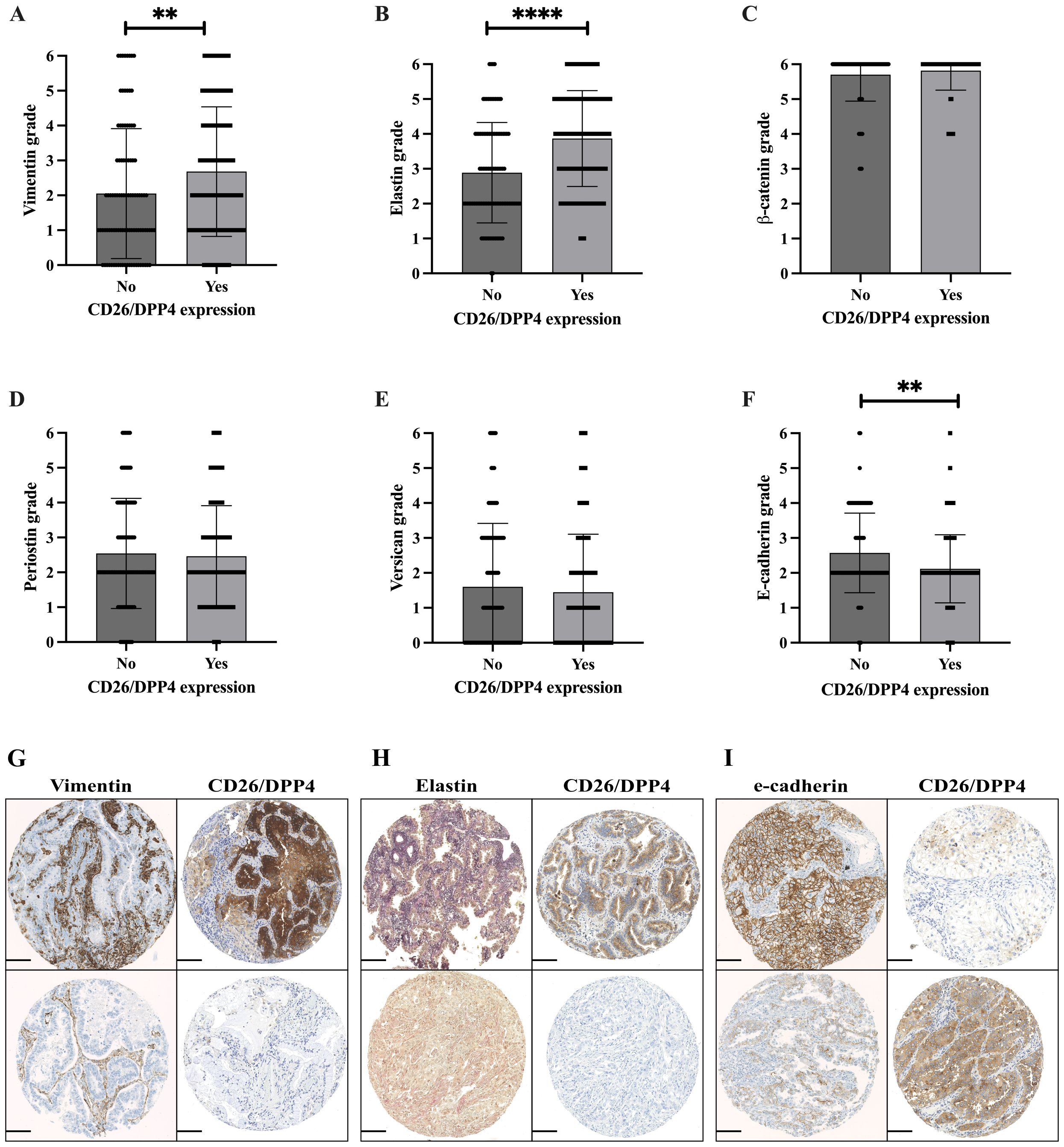 Figure 4. EMT marker analysis in adenocarcinoma in correlation with CD26/DPP4 expression, Vimentin, Elastin, β-catenin, Periostin, Versican, and E-cadherin (A–F). Mann–Whitney U-test; **p < 0.01; ****p < 0.0001. (G–I) Serial section analysis of representative cases; each row represents a single case with various staining scores for specific markers. (G) Upper row: Vimentin score 3/CD26/DPP4 score 3. Lower row: Vimentin score 1/CD26/DPP4 negative. (H) Upper row: Elastin score 3, CD26/DPP4 score 2. Lower row: Elastin score 1, CD26/DPP4 negative. (I) Upper row: E-cadherin score 3, CD26/DPP4 score 1. Lower row: E-cadherin score 1, CD26/DPP4 score 3. Scale bar, 100 µm. EMT, epithelial-to-mesenchymal transition.
