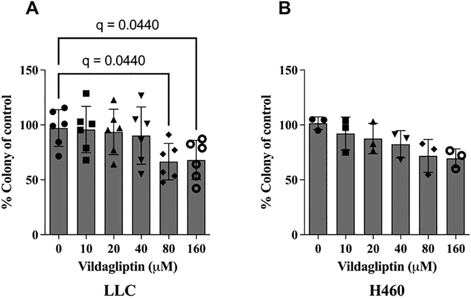 Figure 5. CD26 inhibition by vildagliptin showed reduced colony formation in a dose-dependent manner in the CD26-expressing mouse lung cancer cell line LLC. (A) Mean ± standard deviation, one-way ANOVA, p = 0.0279, False Discovery Rate (FDR) method by Benjamini–Hochberg. In the CD26-positive human lung cancer cell line H460, we observed a similar trend. (B) Mean ± standard deviation, one-way ANOVA, p = 0.0579. LLC, Lewis lung carcinoma.