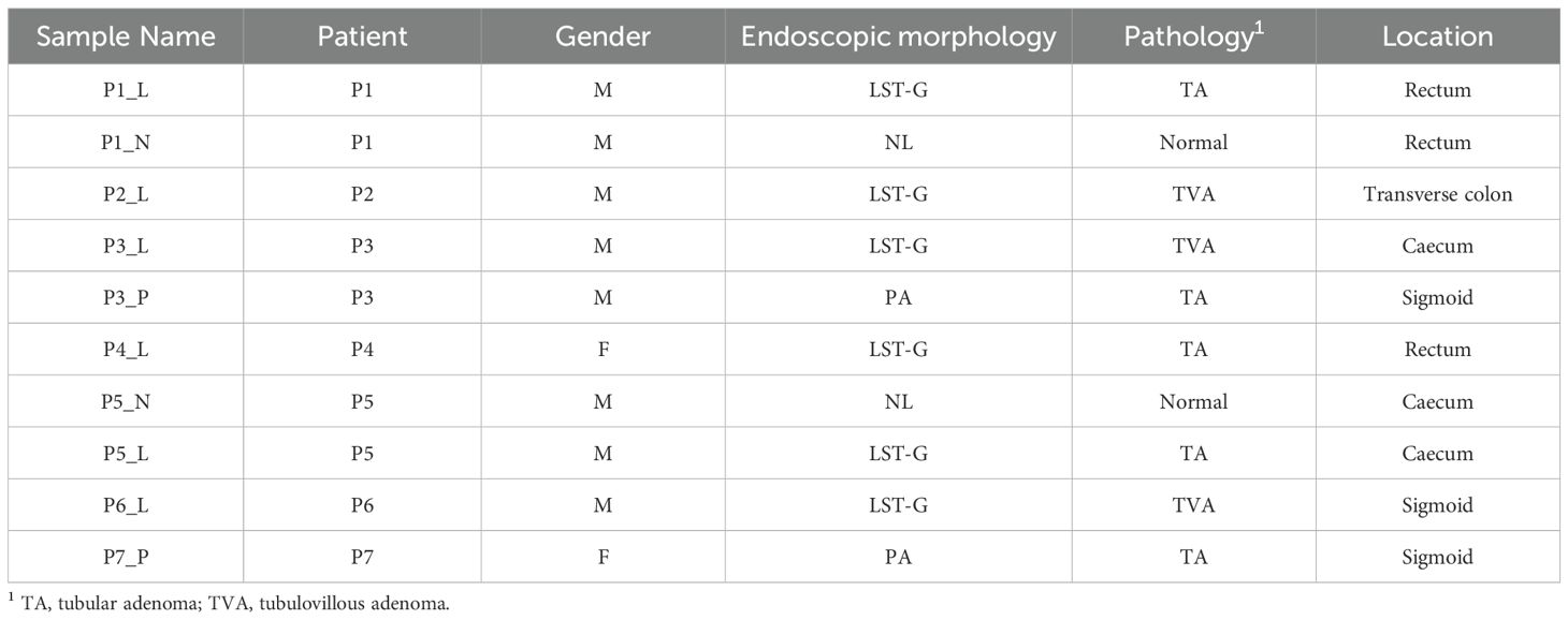 Seven patients diagnosed with adenomatous LST-G or PA were enrolled from Peking University Third Hospital, China. The study protocol was approved by the Medical Research Ethics Committee of Peking University Third Hospital. All patients were diagnosed based on endoscopic and histological examination results. Patients with other infections, gastrointestinal diseases, or other tumors were excluded. Six LST-G samples, two normal mucosa (NL) samples, and two PA samples was incorporated into our single-cell RNA analysis (Table 1).