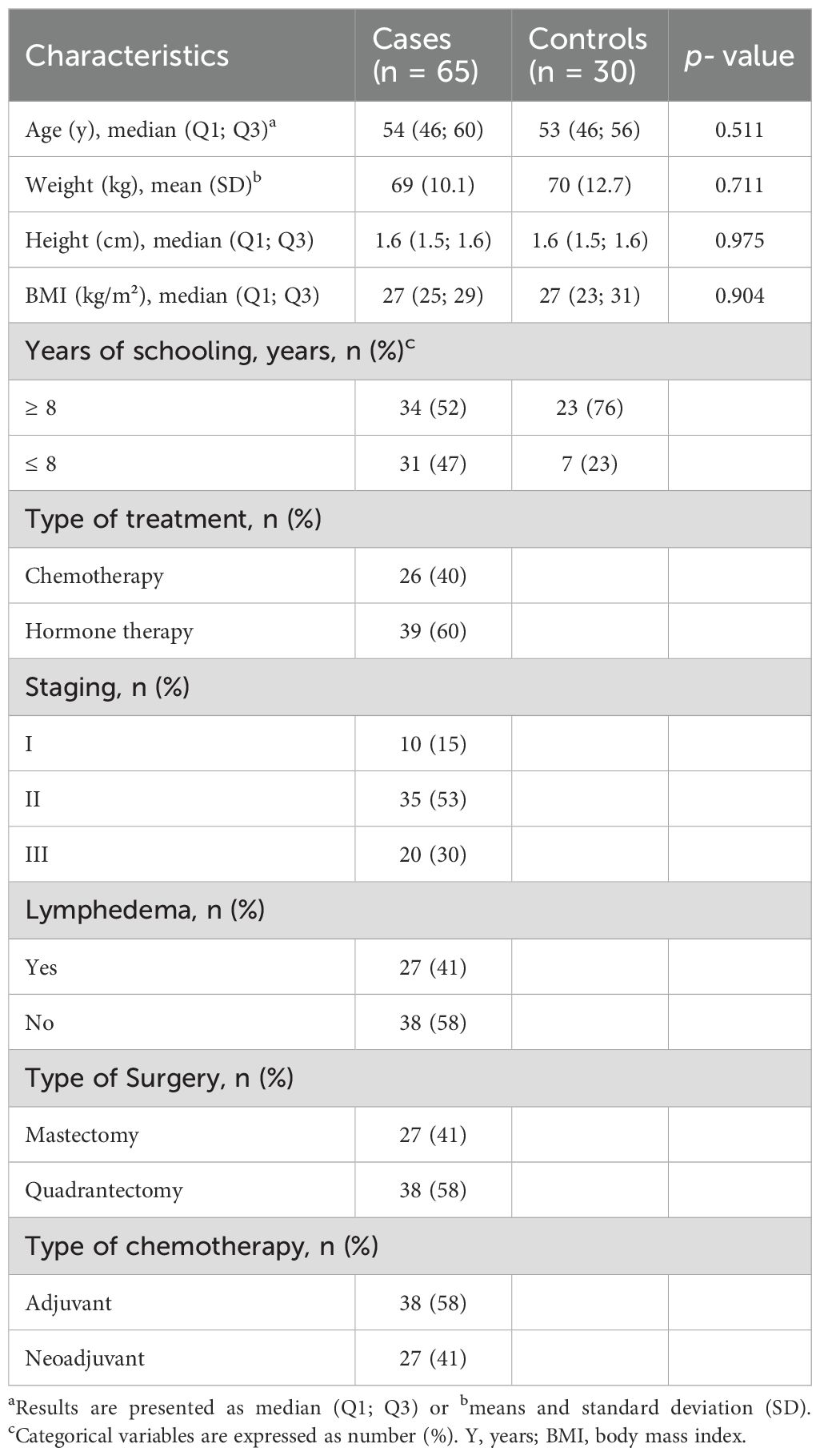 Participants were recruited between October 2021 and August 2022. The study population consisted of 95 individuals (Figure 1). At the time of the research, 65 eligible cases with breast cancer (68.4%) and 30 controls (31.5%) were selected. The participating cases and controls were generally similar with respect to sociodemographic characteristics (Table 1). Most of the study participants were overweight, had more than 8 years of schooling, and the average age was 54 years. Among the cases, about 40% were undergoing chemotherapy treatment and 60% were on hormone therapy, most had stage II breast cancer (36.8%) and 21.4% had lymphedema. Approximately 28.4% of the cases underwent mastectomy and 40% underwent breast-conserving surgery (quadrantectomy). The prevalence of adjuvant chemotherapy was approximately 40%, while neoadjuvant chemotherapy was 28.4% among cases.