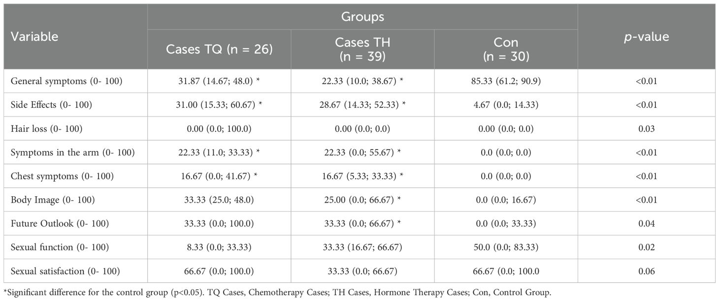 Patients allocated to the chemotherapy and hormone therapy group had a higher presence and intensity of physical and psychological symptoms (general symptoms – 31.87, IQ – 14.67; 48.0 and 22.33, IQ – 10.0; 38.67 respectively), side effects (31.00, IQ – 15.33; 60.67 and 28.67, IQ – 14.33; 52.33 respectively), arm symptoms (22.33, IQ – 11.0; 33.33 and 22.33, IQ – 0.0; 55.67 respectively) and chest symptoms (16.67, IQ - 0.0; 41.67 and 16.67, IQ – 5.33; 33.33 respectively) compared to controls (Table 3). The chemotherapy group had a better perception of body image and future perspectives compared to the control group (33.33, IQ – 25.0; 48.0 and 33.33, IQ – 0.0; 100.0 respectively). There was no statistically significant difference between the groups for sexual function and sexual satisfaction. Regarding hair loss, although there was an effect of the treatment (p = 0.03), the comparisons between cases and controls did not reveal statistically significant differences in scores (p> 0.05).