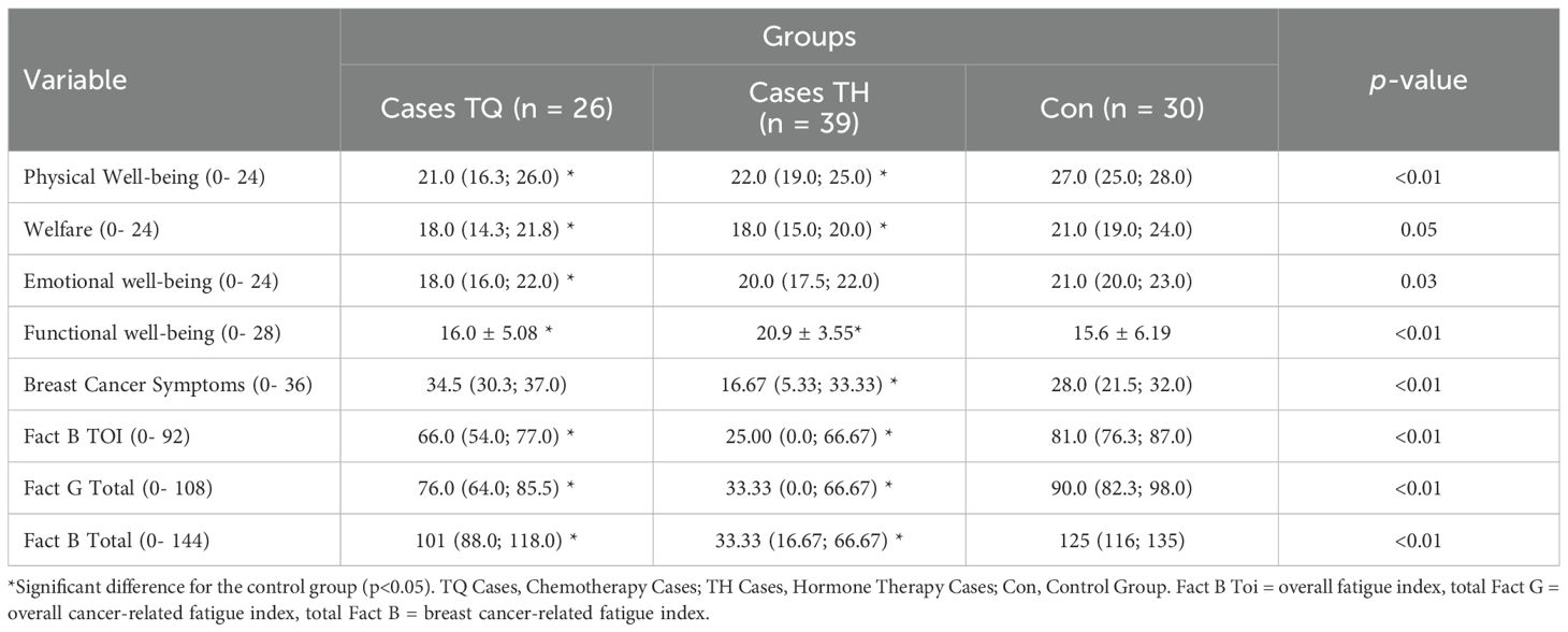 Both cases undergoing chemotherapy and hormone therapy had higher fatigue rates compared to controls in the domains of physical well-being (21.0 IQ – 16.3; 26.0 and 22.0 IQ – 19.0; 25.0 respectively), social well-being (18.0 IQ – 14.3; 21.8 and 18.0 IQ – 15.0; 20.0 respectively), general fatigue (Total Outcomes Index) (59.0 IQ – 53.0; 67.8 and 66.0 IQ – 54.0; 77.0 respectively), general cancer-related fatigue (Fact G) (74.0 IQ – 69.0; 80.5 and 76.0 IQ – 64.0; 85.5) and breast cancer-related fatigue symptoms (Fact B) (95.0 IQ – 88.5; 107.0 and 101 IQ – 88.0; 118.0 respectively) (Table 4). For the functional well-being domain, the cases had lower fatigue rates compared to the controls (16.0± 5.08 and 20.9 ± 3.55, respectively). Only cases on hormone therapy recorded less fatigue related to breast cancer symptoms compared to controls (34.5 IQ – 30.3; 37.0). There was a higher rate of emotional fatigue for the cases undergoing chemotherapy when compared to the controls (18.0 IQ –16.0; 22.0). No differences were observed between the groups for other comparisons (p> 0.05).