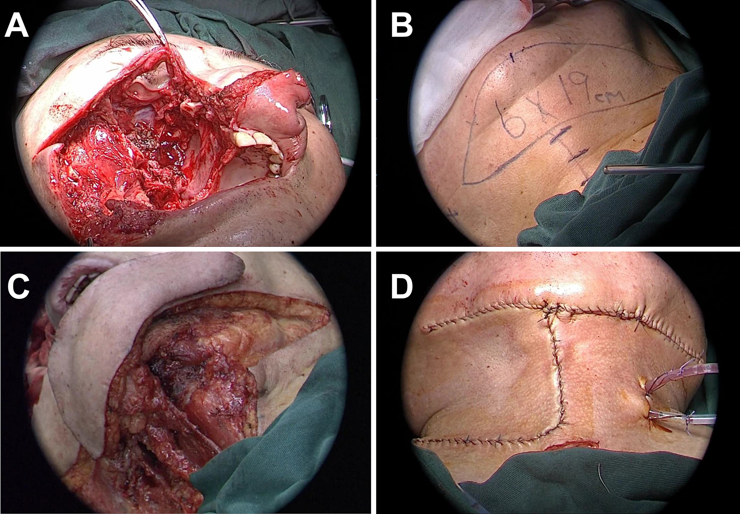 Surgical process of resection and reconstruction of malignant tumor in the right maxilla. (A) Surgical cavity after completion of right maxillectomy, removal of contents of the right orbit, and resection of anterior skull base lesions. (B) Schematic design of the submental artery perforator flap, with the flap size marked as 6x19 cm. (C) Preparation of the submental artery perforator flap for transplantation to the damaged area. (D) Post-suturing appearance of the repair of facial and intraorbital defects using SMAPF.