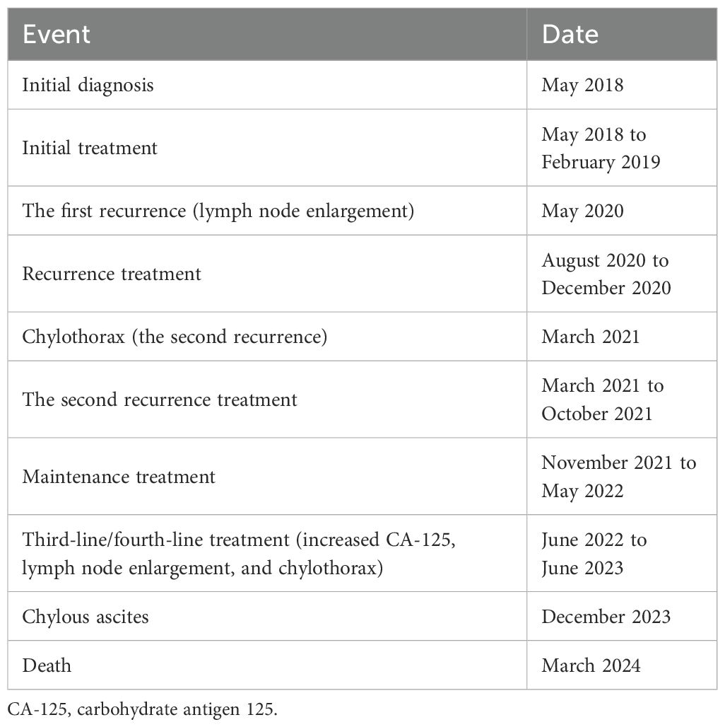 A 64-year-old woman presenting with abdominal distension and loss of appetite for 1 month was referred to our hospital in May 2018 (Table 1). Physical examination revealed massive abdominal distension with free fluid in the abdominal cavity. Contrast-enhanced computed tomography (CT) showed multiple cystic solid mass lesions with rich blood supply in the pelvis, the largest approximately 18 × 15 cm; multiple enlarged retroperitoneal lymph nodes (up to 5 cm in diameter); enlarged mediastinal lymph nodes; massive ascites; and bilateral pleural effusion (9.2 and 3.9 cm in depth in the left and right, respectively). The serum carbohydrate antigen 125 (CA-125) was 1,539 U/mL. Abdominal puncture and thoracentesis were performed. Both ascites and pleural fluid were serous and yellow in appearance. Adenocarcinoma cells were found on cytology from both ascites and pleural fluid. Ovarian epithelial cancer was diagnosed in stage IV. Neoadjuvant chemotherapy with paclitaxel and carboplatin was given for three cycles with interleukin-2 left-sided chest perfusion once (from May 2018 to October 2018). Both ascites and pleural fluid disappeared after one course of chemotherapy. An optimal intermediate cytoreductive procedure was performed with residual lesions <1 cm (R1) on November 13, 2018. Histopathology result showed moderately differentiated (G2) serous papillary adenocarcinoma in both ovaries, diffuse metastatic adenocarcinoma nodules in the omentum, and multiple metastases existing in the para-aortic lymph nodes and bilateral pelvic lymph nodes (4/6, 13/22, and 14/15, respectively). Four courses of chemotherapy were given after the operation (from December 2018 to February 2019).