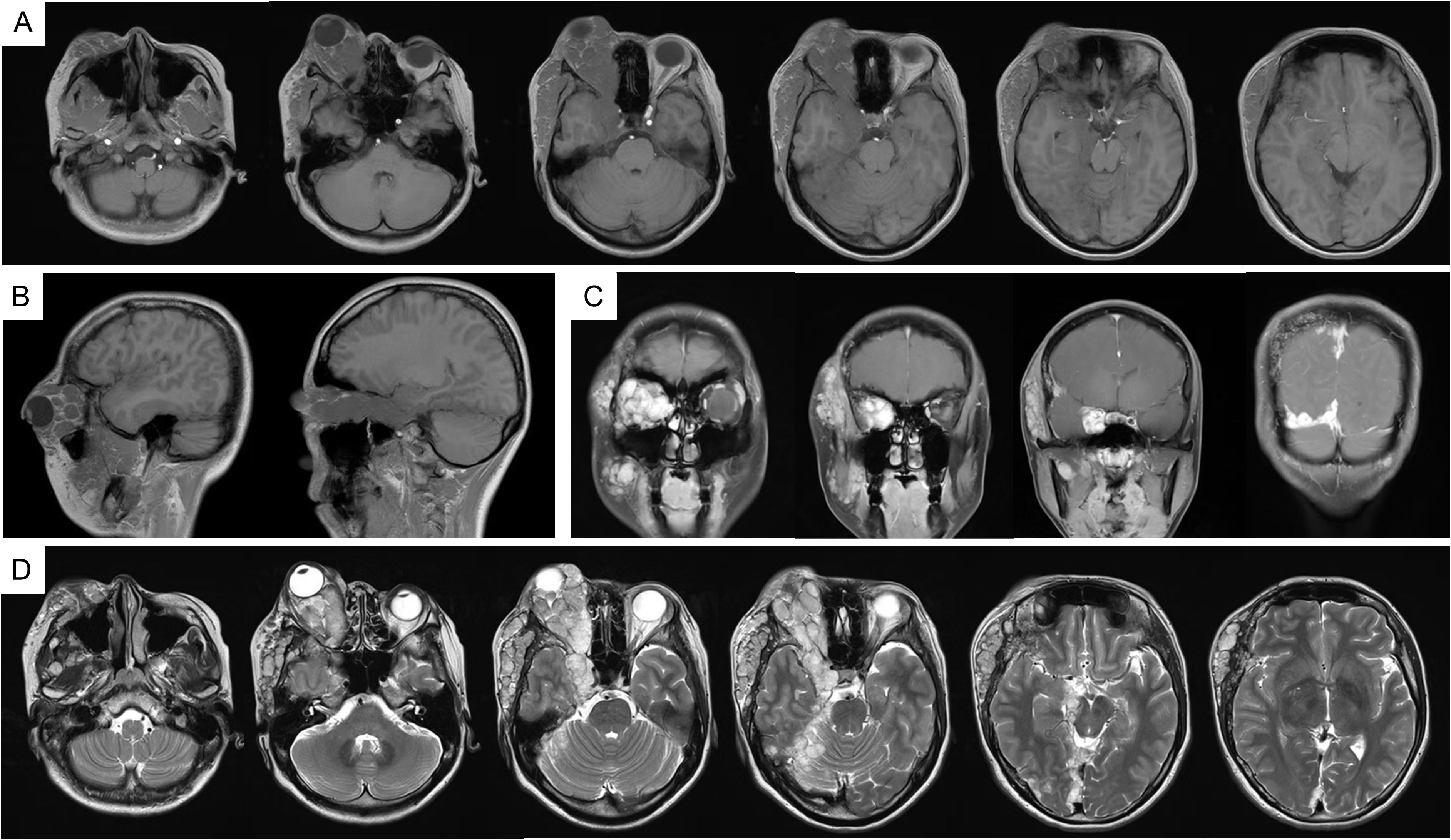 In 2013, a 20-year-old female with no significant past medical history presented with progressive swelling of the right eye and gradual visual decline. The patient denied ocular pain, facial numbness, or other neurological deficits. The first medical consultation and imaging evaluation took place in 2015. The initial magnetic resonance imaging (MRI) (Supplementary Figure 1) revealed circumscribed retro-orbital mass located posterior to the right globe. The mass compressed the right eyeball anteriorly and encased the optic nerve, leading to disruption of both the optic nerve and surrounding extraocular muscles. On T1-weighted images (T1WI), the lesion appeared isointense relative to adjacent muscles, while T2-weighted images (T2WI) demonstrated heterogeneous hyperintensity with clustered components. Mild, heterogeneous contrast enhancement was observed. The mass extended into the cavernous sinus, posterior longitudinal fissure, right cerebellar tentorium, and subcutaneous temporal soft tissues, raising a preliminary radiologic impression of a giant cavernous sinus hemangioma (CSH). The patient had not received any treatment at that time. The patient experienced progressive worsening of proptosis and right-sided facial swelling. A repeat MRI in 2019 confirmed significant enlargement of the lesion with persistence of the same anatomical involvement (Supplementary Figure 2).