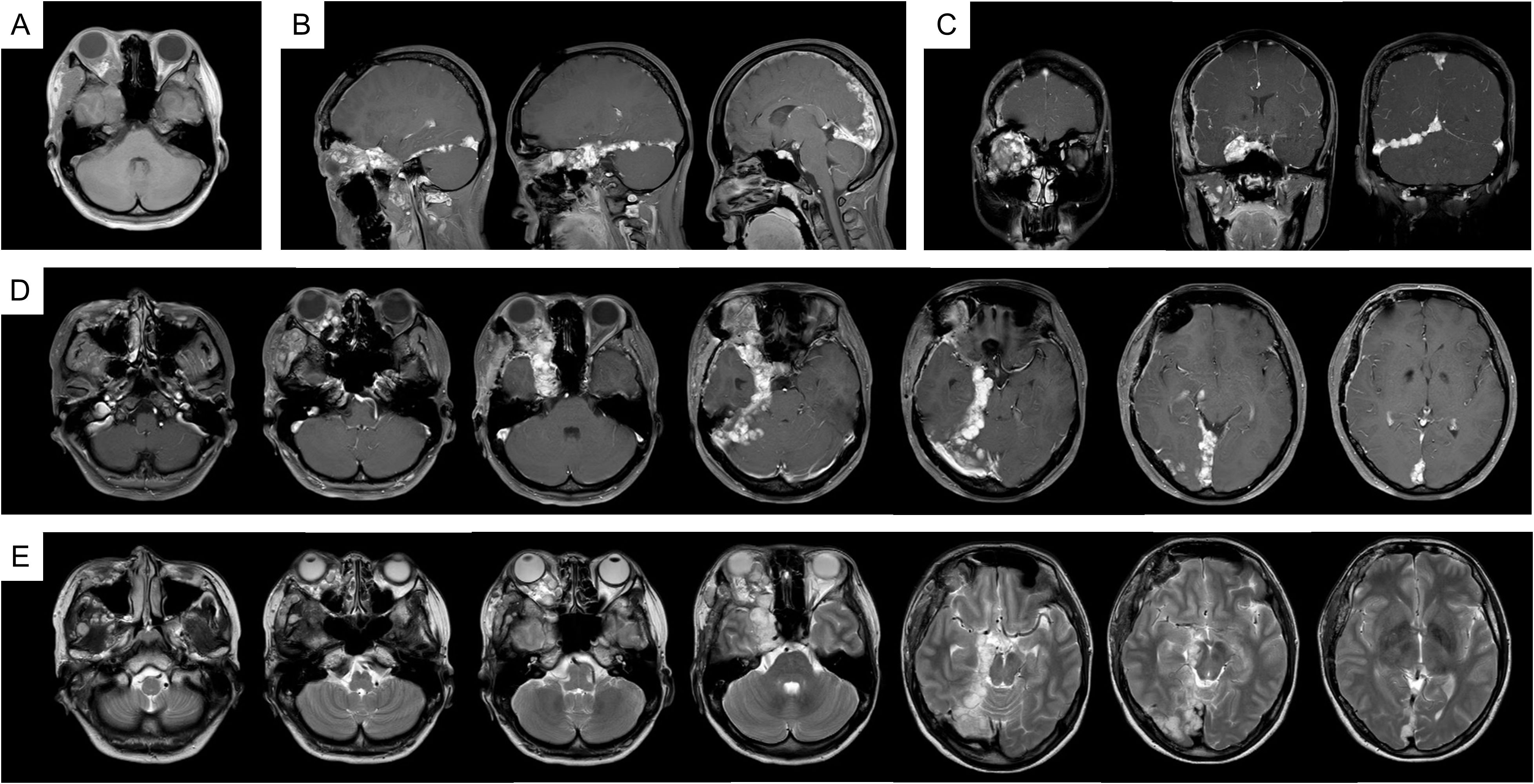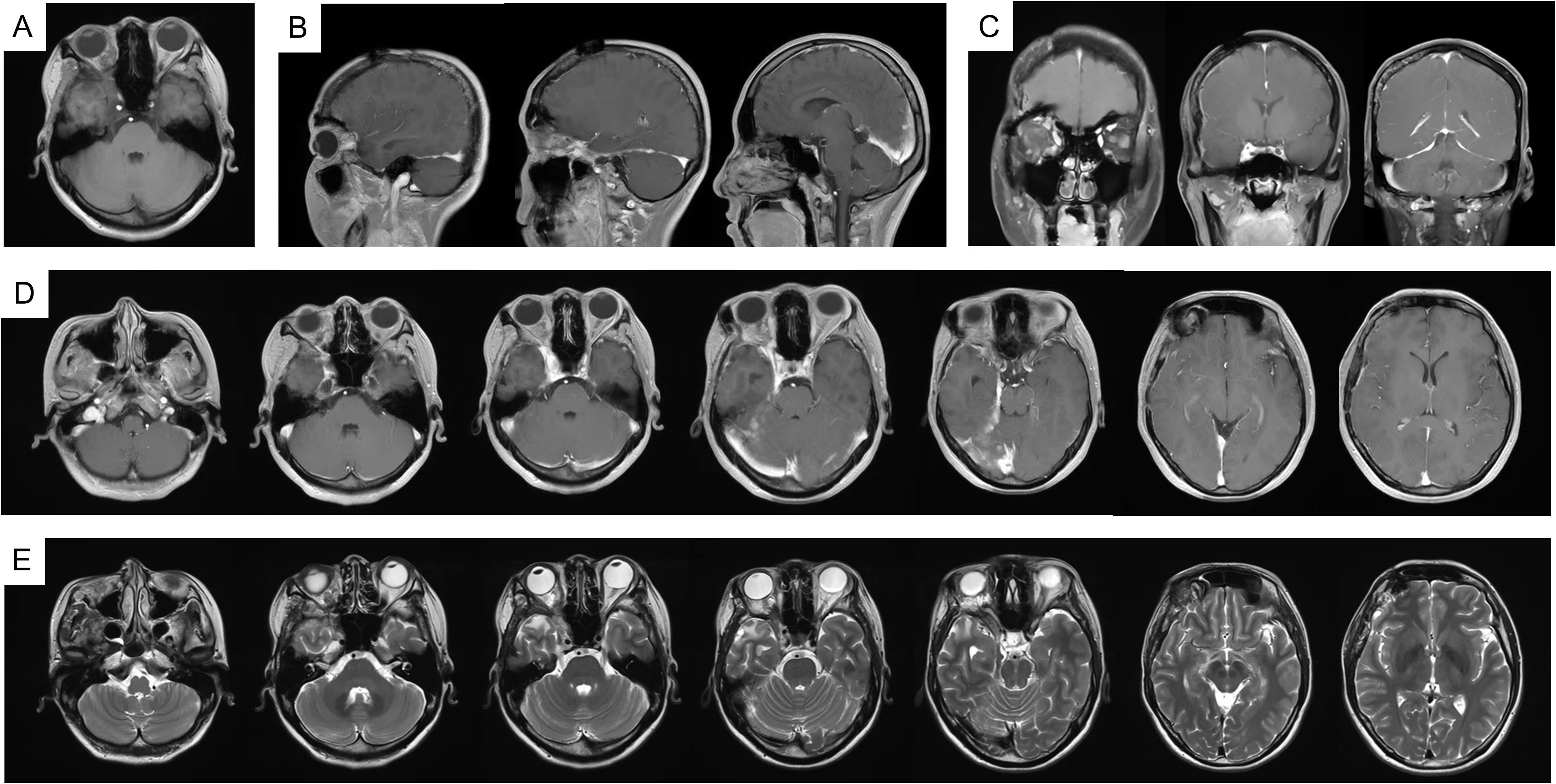Figure 2. MRI imaging after the palliative surgery. (A) T1WI; (B) T1WI-C coronal view; (C) T1WI-C sagittal view; (D) T1WI-C; (E) T2WI-TSE.