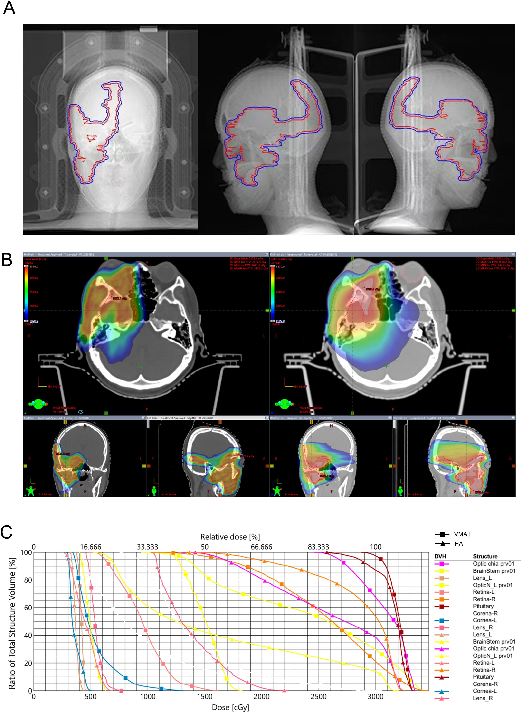 In head and neck radiotherapy, VMAT is commonly employed as the standard technique (14). In the present case, the tumor’s invasion into the orbit, cavernous sinus and intracranial required a treatment plan with a high degree of target conformity and a steep dose gradient. The tumor’s proximity to vital structures, such as the eyeball, posed significant challenges in balancing effective tumor coverage with sparing of OARs. As showed in Figure 5, the comparison of radiotherapy plans for HA and VMAT exhibited significant differences in spatial dose distributions. The isodose lines for the HA plan exhibited superior closure compared to VMAT. The calculations suggested that HA outperformed VMAT in terms of CI, GI and HI. Notably, HA resulted in lower radiation doses to critical OARs, providing enhanced protection for structures such as the cornea, retina, optic nerve, parotid and brainstem. This reduction in radiation exposure is crucial in minimizing the risk of treatment-related complications. Published studies have also demonstrated HA plans generated a lower dose to the OARs and the normal tissue (15, 16). In our opinion, HA played a pivotal role in reducing adverse reactions during the radiotherapy course.