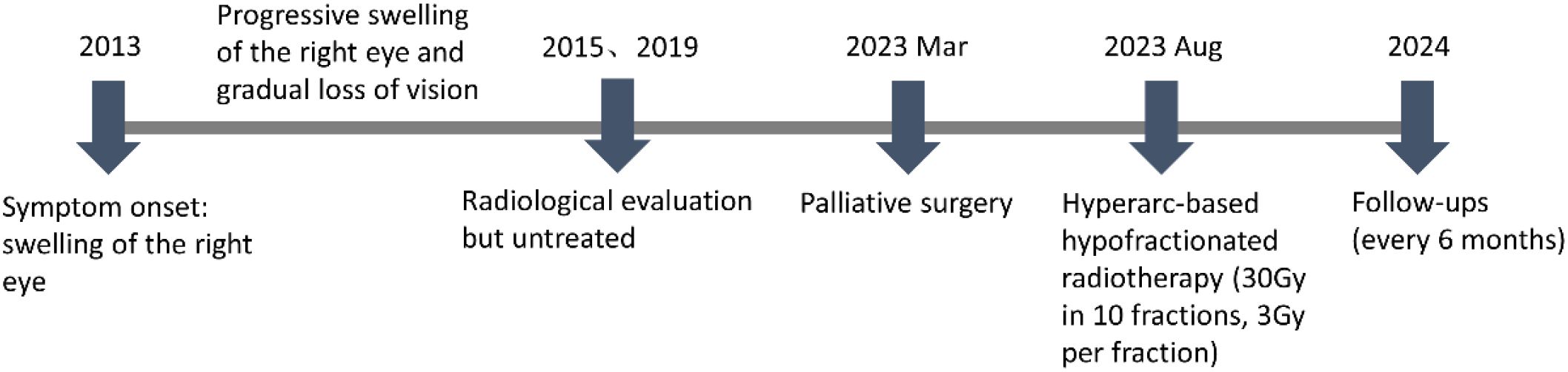 In fact, the patient tolerated the radiotherapy well and experienced no significant adverse effects during treatment. At two months post-radiotherapy, marked improvement in right facial swelling was observed. MRI confirmed a reduction in both subcutaneous soft tissue swelling and cerebral hemisphere edema (Supplementary Figure 3). Follow-up evaluations were conducted every six months. At six months post-radiotherapy, imaging showed no evidence of disease progression (Supplementary Figure 4). Encouragingly, there was 69% and 79% volume reduction at six and thirteen months. The patient’s facial symmetry has been restored and there has been no evidence of tumor progression (Figure 4), signifying the effectiveness and tolerability of the treatment. Unfortunately, the patient has persistent ptosis of the right eyelid and unrestored vision due to irreparable neurological damage. Postoperative hypofractionated HA radiotherapy was administered for the patient to address the remaining tumor and prevent further progression. The clinical timeline of this patient was illustrated in Figure 5.