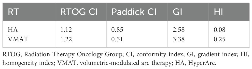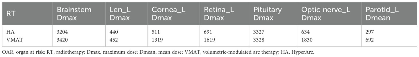 HyperArc (HA), delivered via the Varian TrueBeam linear accelerator, is a novel non-coplanar multi-arc radiotherapy technique that has shown considerable promise in the treatment of head and neck tumors as well as intracranial metastases (4). The HyperArc planning system enables safe dose escalation while achieving optimal target coverage. Several studies have highlighted its ability to significantly improve target dose uniformity, generate sharp dose gradients outside the target, and minimize radiation exposure to organs at risk (OARs), including the lens, retina, and optic nerve (5–7). These advantages contribute to a decreased incidence of radiation-induced adverse effects such as vision loss, blindness, and corneal ulceration during radiotherapy (RT).