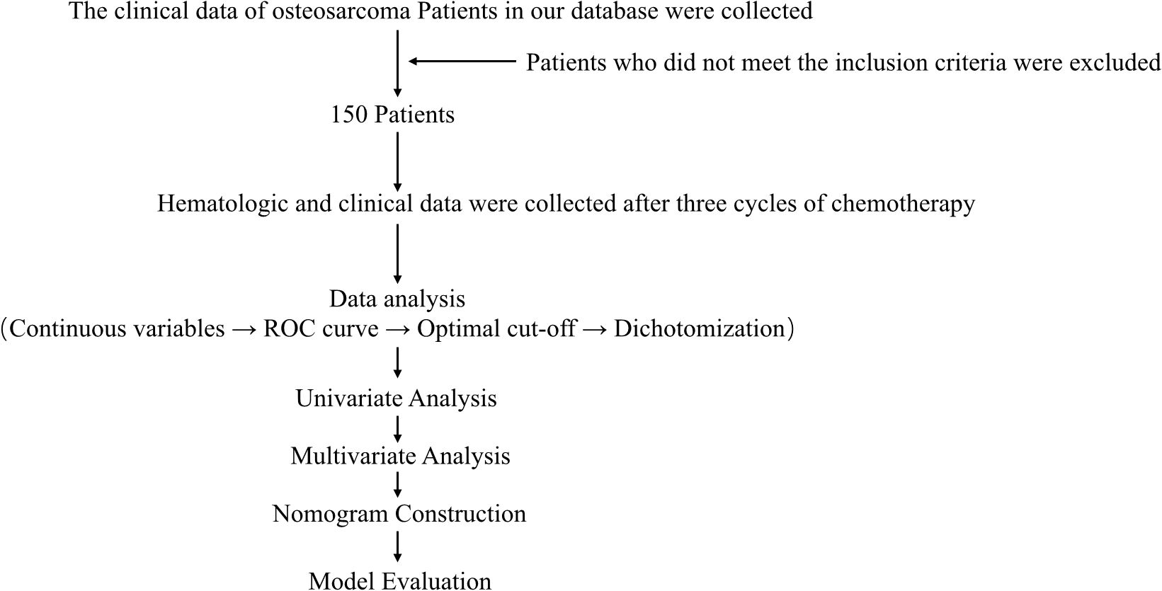 The flow chart through this study is presented in Figure 1. With approval from the Medical Ethics Committee, we retrospectively reviewed the clinical data of osteosarcoma patients recorded between January 2012 and January 2022 in the database of the Musculoskeletal Tumor Center at West China Hospital. Patient selection was conducted based on the following inclusion criteria: (1) histopathologically confirmed high-grade osteosarcoma; (2) availability of complete hematological test results following neoadjuvant chemotherapy; and (3) administration of three cycles of neoadjuvant chemotherapy at our institution prior to surgery. The exclusion criteria were as follows: (1) histopathologically confirmed low-grade osteosarcoma (intramedullary and bone surface) or periosteal osteosarcoma; (2) prior neoadjuvant chemotherapy received before the first consultation at our hospital; (3) presence of hematological disorders; (4) diagnosis of other malignancies; and (5) failure to receive standard treatment, including cases of misdiagnosis, mistreatment, or incomplete postoperative chemotherapy. After applying these criteria, a total of 150 patients were included in the study. Each patient was followed up regularly until death or until January 2022. The follow-up schedule adhered to the following protocol: reexaminations every 3 months within the first year post-surgery, every 4 months during years 1–2, every 5 months during years 2–3, every 6 months during years 3–5, and annually beyond 5 years post-surgery.