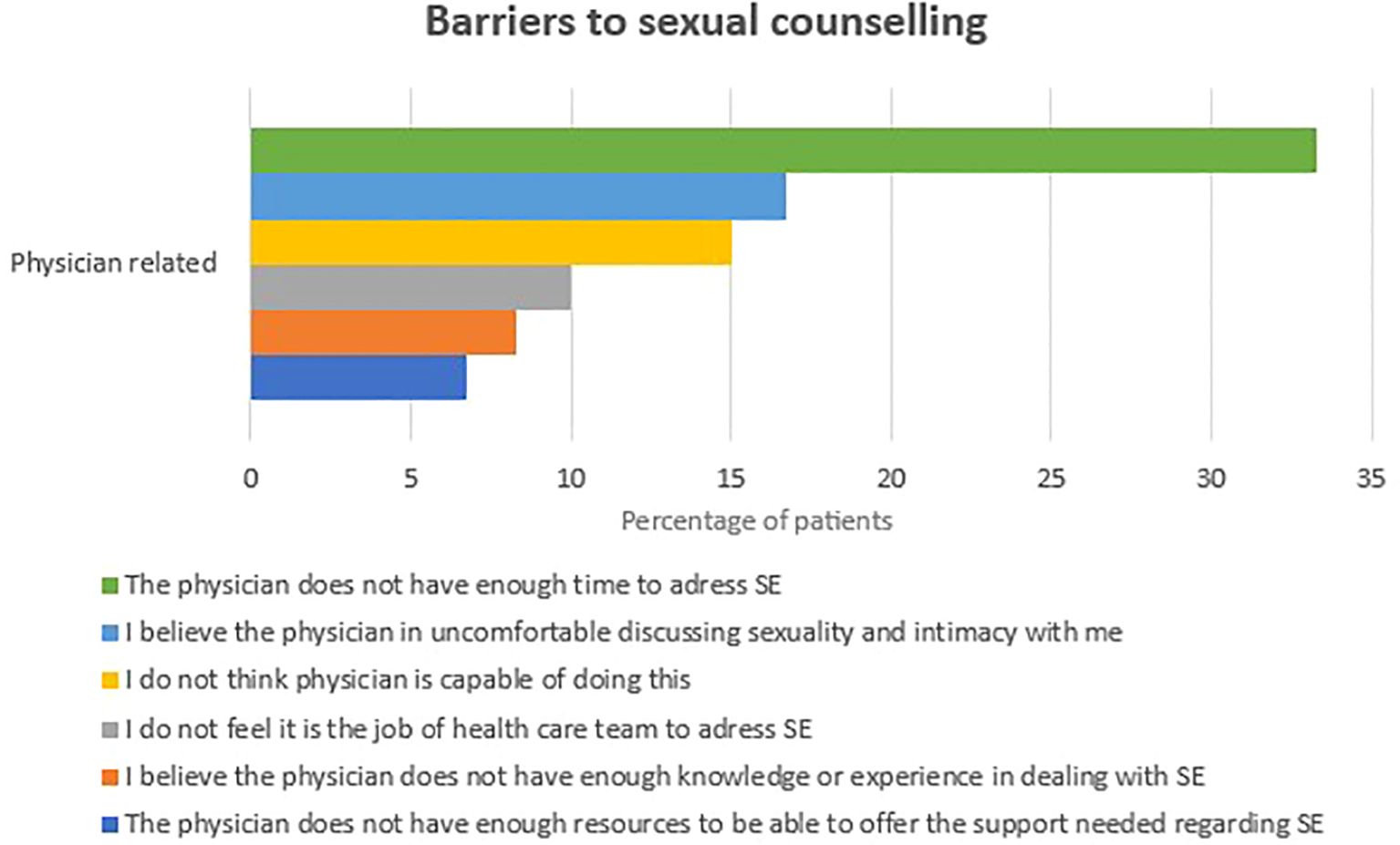 Results: Sixty married patients participated in our survey, most of whom (n=27; 45%) had cervical cancer. The mean age of patients was 52, and for their sexual partners was 57. Two-thirds (66.7%) reported sexual activity (SA) as a somewhat or very important aspect of their life. While 48% reported that their partners noted a negative impact on SA after treatment, none considered stopping treatment to preserve sexual function. Although 86% felt it was important to discuss SE at clinic, and 41.7% specified that the timing of this discussion should be before treatment, only 35% of patients had had this discussion throughout their treatment and follow up. This discussion was held by the physician in 94% of instances. The most common barrier to discussion was having a male physician (71%), followed by embarrassment (60%). In our analysis, we found that physicians tend to discuss SA with patients who had younger sexual partner’s (p value = 0.024).