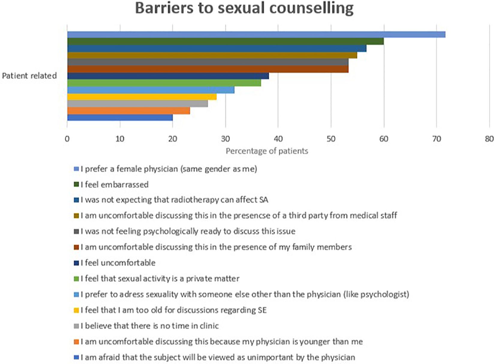 On the other hand, the most frequently reported patient-related barriers included a preference for gender concordance, with 71.7% (n=43) specifically preferring a female physician. Other common barriers included feelings of embarrassment (60%, n=36) and a lack of awareness that radiotherapy could affect SA (56.7%, n=34). Patients also cited concerns about a lack of privacy in the clinic due to the presence of third parties such as healthcare staff (55%, n=33) or family members (53.3%, n=32), psychological readiness to discuss SE (53.3%, n=32), and discomfort with the discussion (38.3%). Additionally, some patients considered SA a private matter (36.7%), preferred to discuss SE with someone other than their physician (31.7%), felt their age was inappropriate for discussing SE (28.3%), and noted a lack of time during clinic visits (26.7%). Discomfort related to the physician’s age (23.3%) and concerns that SE might be deemed unimportant by the physician (20%) were also reported (Figure 3).