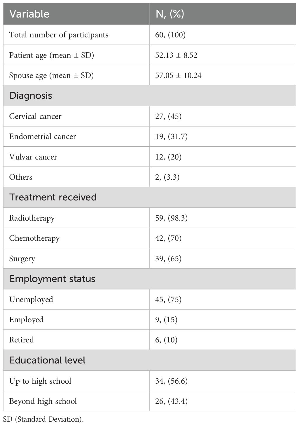 Sixty patients completed the questionnaire, yielding a response rate of 95%, with only three patients declining to participate. The mean age of the participants was 52 ± 8.52 years, while the mean age of their husbands was 57 ± 10.24 years. The majority of patients were diagnosed with cervical cancer (45%, n=27), followed by endometrial cancer (31%, n=19), vulvar cancer (20%, n=12), and other types (3.3%, n=2). Nearly all patients were treated with radiotherapy (98.3%, n=59), and most of them had multimodality treatment, including chemotherapy (70%, n=42) and surgery (65%, n=39). A significant proportion of respondents held higher educational degrees (43.4%, n=26), with 15% (n=9) currently employed and 10% retired. Detailed demographic information is provided in Table 1.