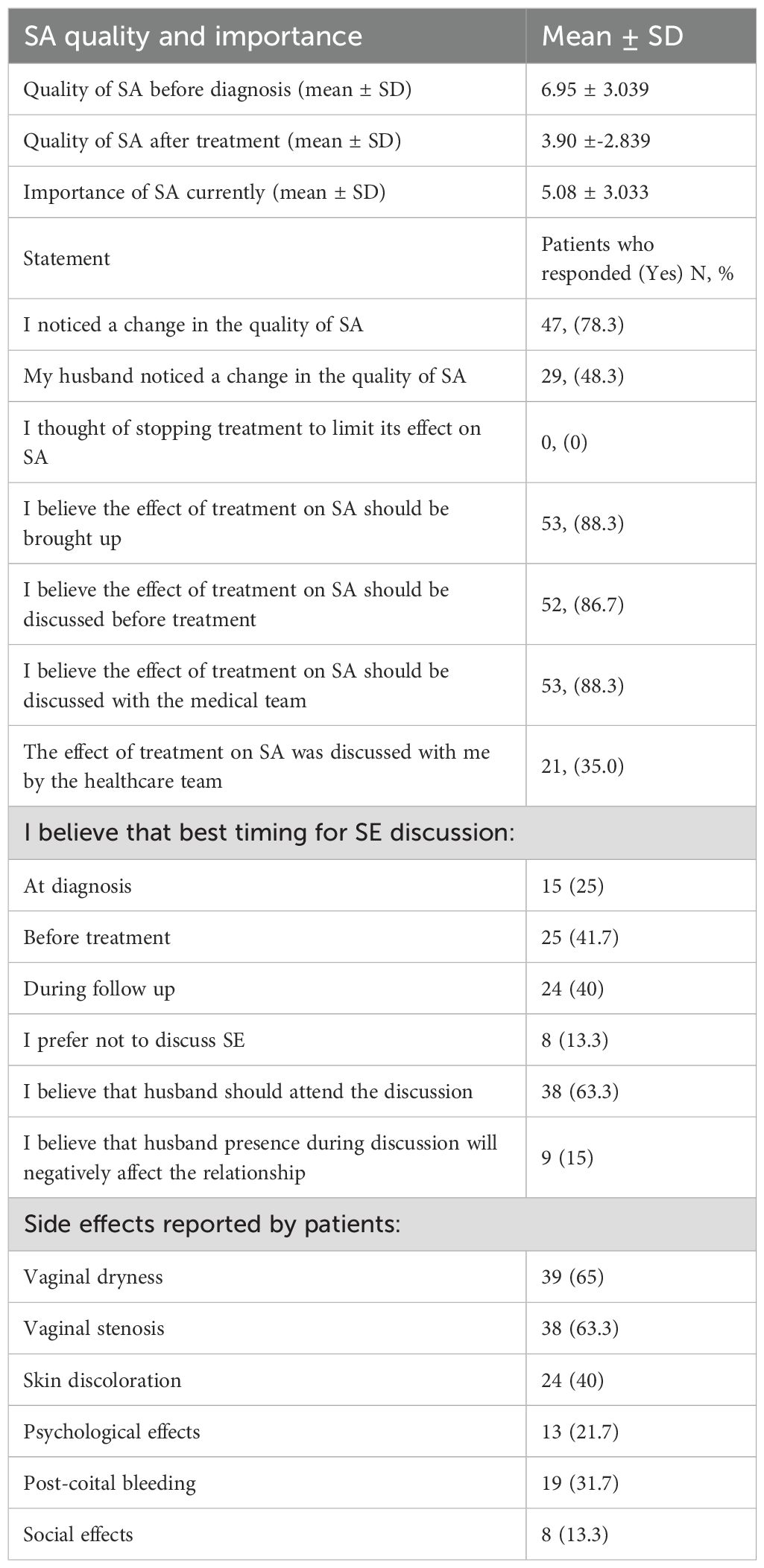 Although, SA among gynecological cancer survivors was addressed before in research from the MENA region (19), this is the first study to address SE among these patients in a cohort from a comprehensive cancer center in the region. Our findings indicate that 88.3% of patients prefer to include SE and discussions about these issues as part of their healthcare.