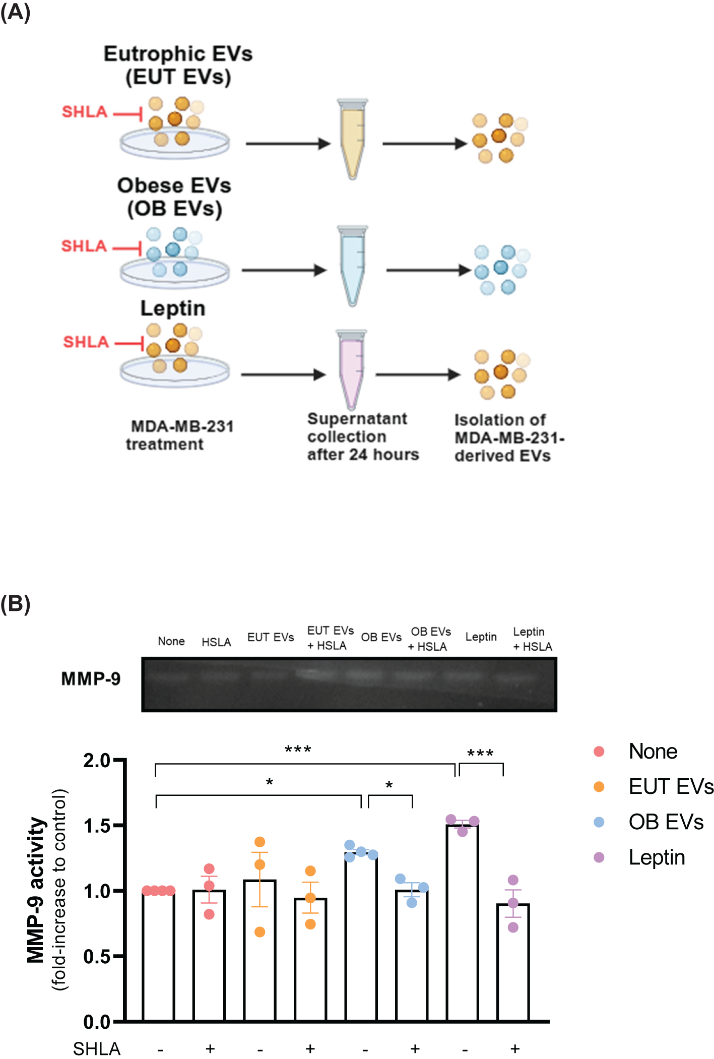 Figure 5. Leptin in OB EVs increases MMP-9 activity in MDA-MB-231 cells. (A) MDA-MB-231 cells were primed for 1 hour with 20% extracellular vesicles from eutrophic (EUT EVs) or obese (OB EVs) adipose tissue, 100 nM recombinant leptin, and/or 250 ng/mL human super-active leptin antagonist (SHLA). Following stimulation, cells were maintained in DMEM containing 1% FBS for 24 hours. Supernatants were then collected, and cells were lysed. (B) Supernatants were centrifuged at 20,000 × g for 70 minutes at 4°C to isolate EVs. The EV pellets were resuspended in lysis buffer with a protease inhibitor cocktail. Samples were subjected to SDS-PAGE using a gelatin-containing polyacrylamide gel to assess MMP-9 enzymatic activity. Gels were incubated in developing buffer for 72 hours at 37°C, stained with 0.2% Coomassie Brilliant Blue, and destained until clear digestion bands appeared. Band intensity was quantified using ImageJ software. Results are representative of three independent experiments. Statistical analysis was performed using one-way ANOVA with Sidak’s post hoc test. Data are presented as mean ± SEM. * Significance: * p < 0.05, *** p < 0.005.