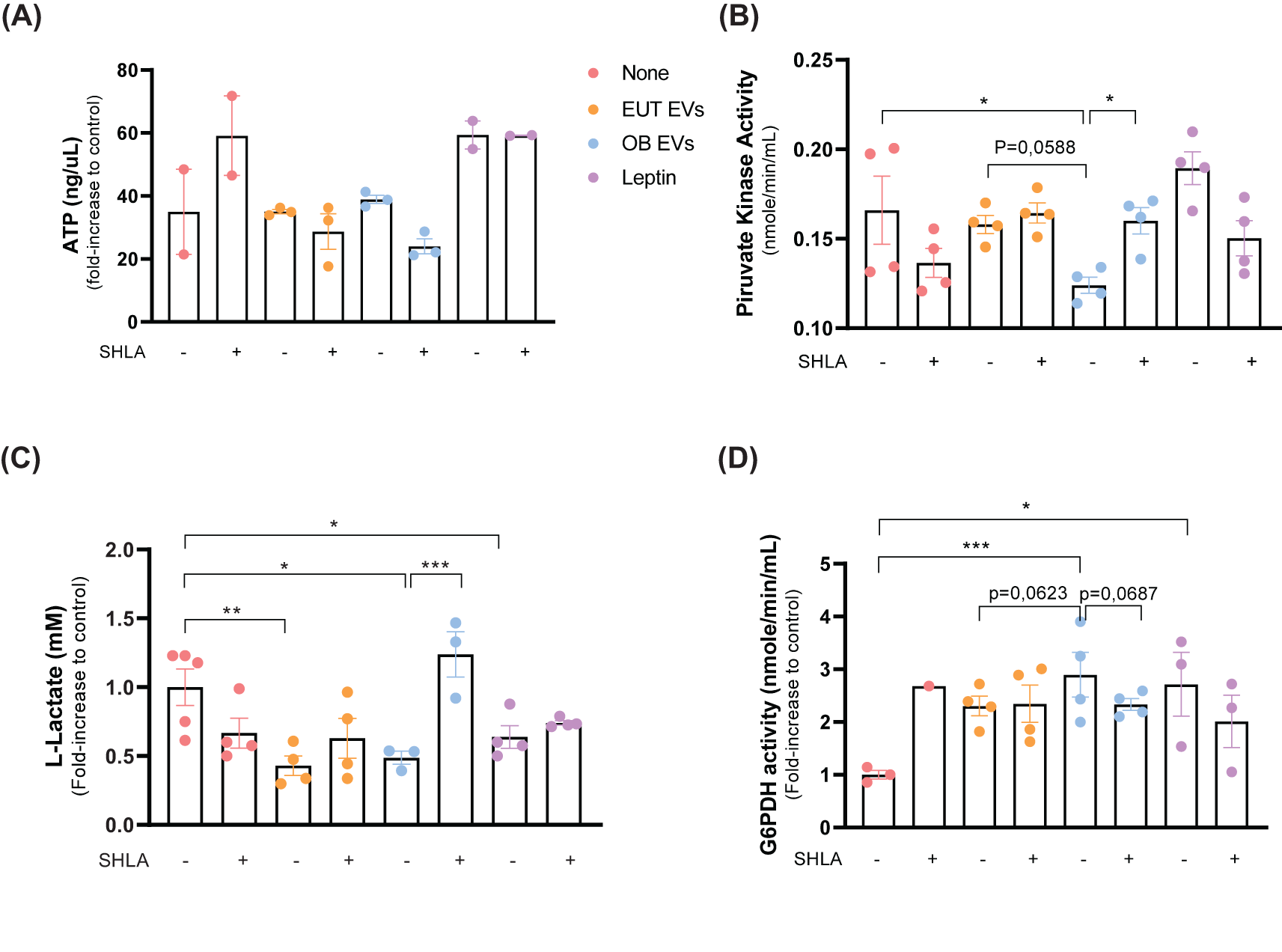 Figure 6. Leptin in OB EVs reduces glycolytic metabolism and enhances pentose phosphate pathway activity in MDA-MB-231 cells. MDA-MB-231 cells were treated with 20% extracellular vesicles derived from eutrophic (EUT EVs) or obese (OB EVs) adipose tissue, 100 nM recombinant leptin, and/or 250 ng/mL of the human super-active leptin antagonist (SHLA). (A) After 30 minutes of treatment, intracellular ATP levels were measured using the MAK190 colorimetric assay kit. (B) Pyruvate kinase (PK) activity was assessed after 24 hours of treatment using the MAK071 colorimetric kit. (C) Cells were primed for 1 hour and cultured for an additional 24 hours before lysis. Lactate production was quantified using the MAK329 colorimetric assay. (D) Glucose-6-phosphate dehydrogenase (G6PDH) activity was evaluated in cell lysates after 24 hours of treatment using the MAK014 colorimetric kit. Data represent 3–4 independent experiments and are expressed as mean ± SEM. Statistical significance was determined using one-way ANOVA followed by Sidak’s post hoc test. *Significance: *p < 0.05, **p < 0.01, ***p < 0.005.