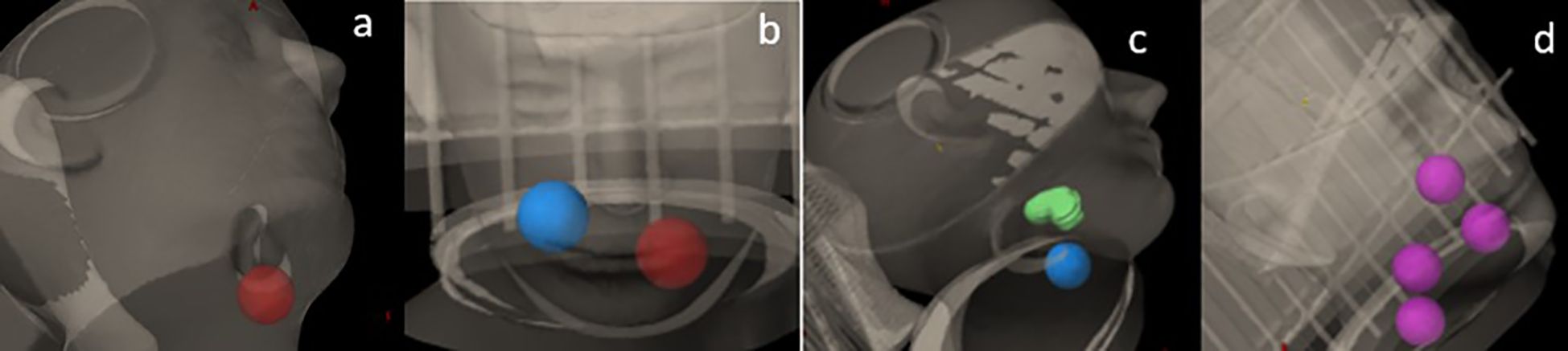 As shown in Figure 2, each target was named as gross target volume (GTVx), where x represented a specific target from one to four. A central contour V_SHDCx represented the volume of a single high-dose core. The contouring of V_SHDCx followed the method used in the study by Massaccesi et al. (16) Massaccesi et al. used the central one-third of the GTV as the high-dose core for planning, while we used V_SHDCx of 0.5, 1.0, and 1.5 cm in diameters to investigate the dosimetry impact of V_SHDCx volume sizes. To achieve better dose conformity, additional planning contours, such as the ring structure, were added in the plan optimization. The central one-third of the GTVx volume (diameter of 2.1 cm) was contoured as GTVx_central to represent the central hypoxic tumor zone, and the rest of GTVx outside GTVx_central was contoured as GTVx_peripheral (16). Typically, the ratio of the central high-dose core volume to the GTV is defined by Equation 1.