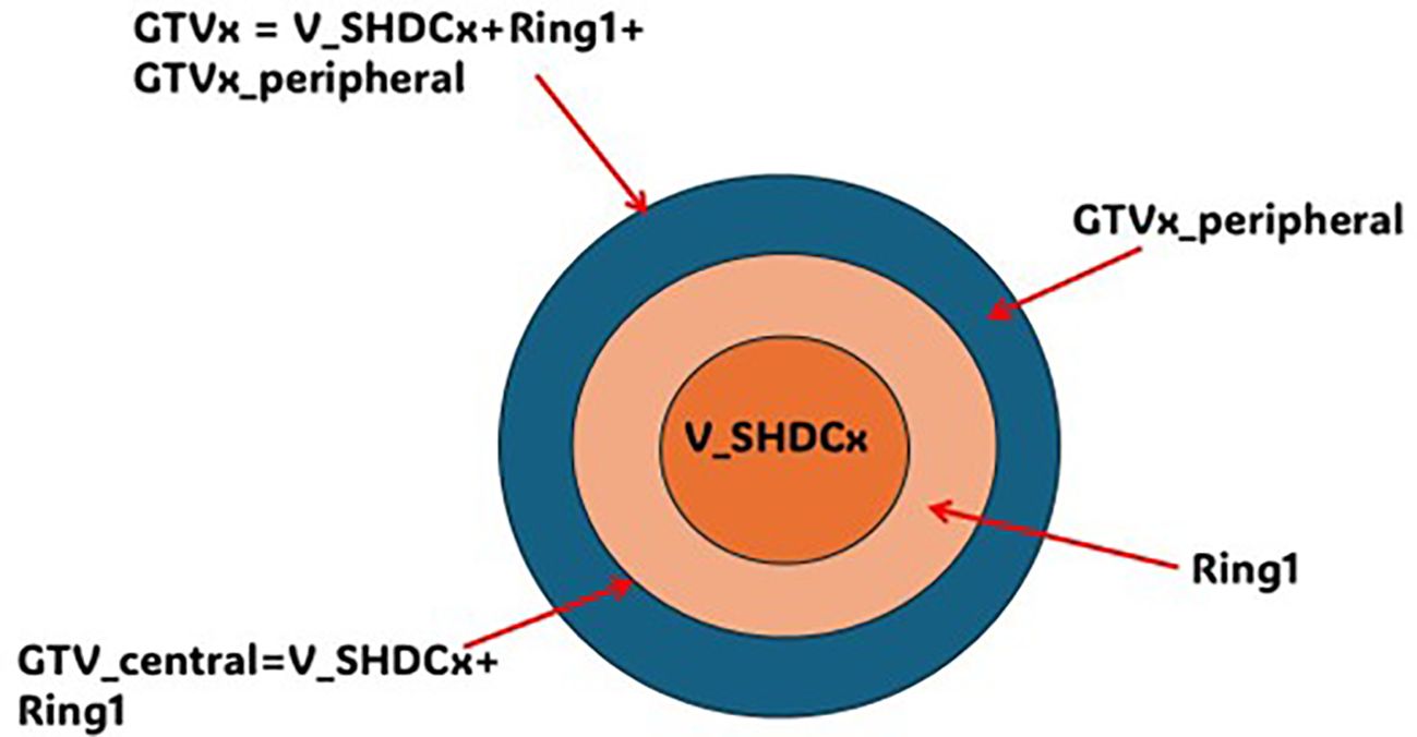 Figure 2. Illustration of GTVx, GTVx_peripheral, GTVx_central, Ring1, and V_SHDCx. x, target 1–4; GTVx_central = V_SHDCx + Ring1; GTVx = GTVx_central + GTVx_peripheral.