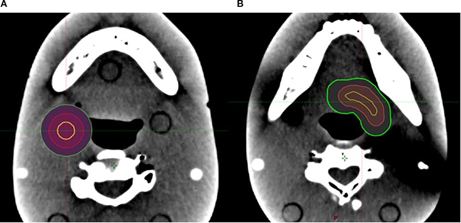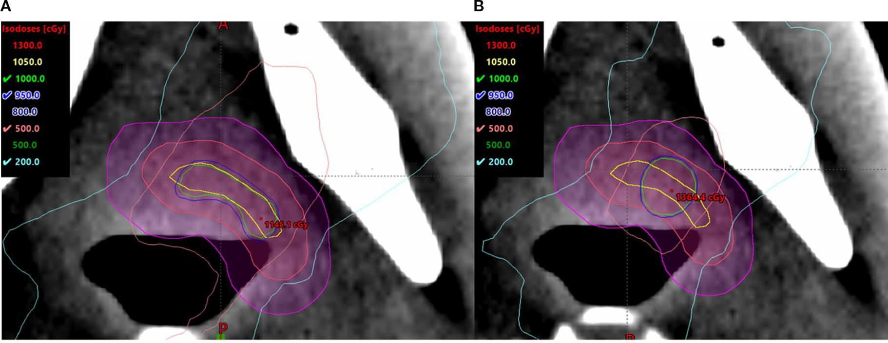 Figure 6. Irregularly shaped target using V_cSHDC (A) and spherical V_SHDC of an equivalent volume (B).