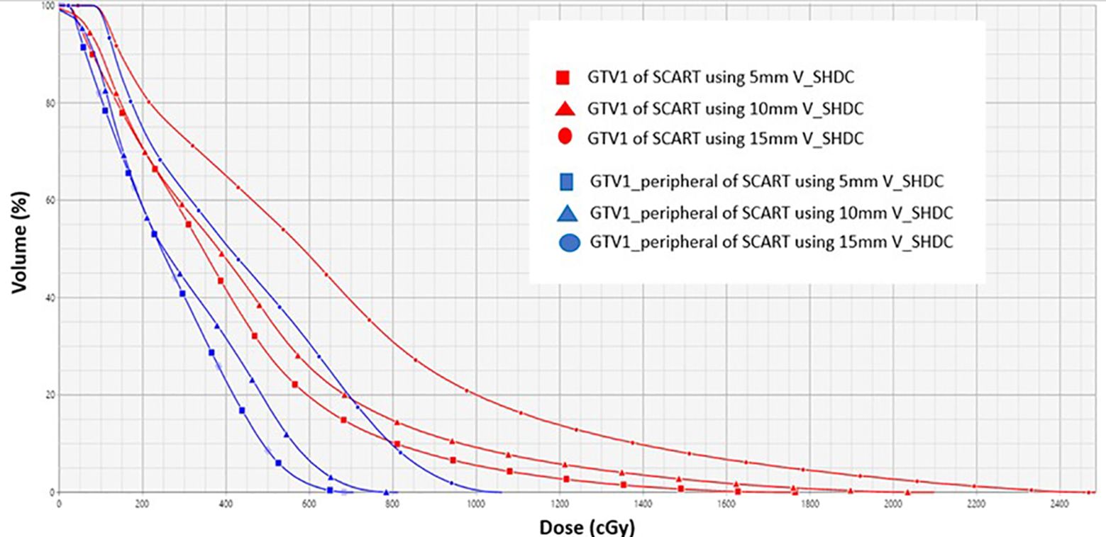 Figure 4. DVH curves of GTV1 (red) and GTV1_peripheral (blue) from SCART plans for using 5-, 10-, and 15-mm diameters of V_SHDC. SCART, stereotactic core ablative radiation therapy.