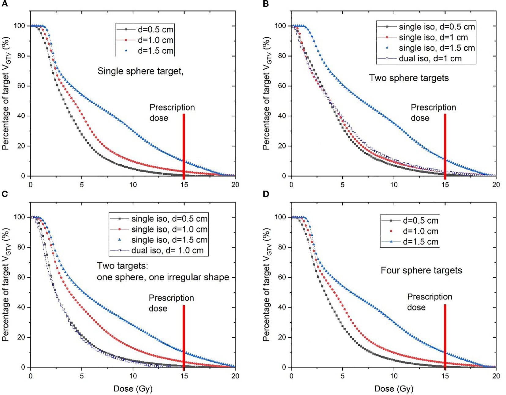 Figure 5. DVH curves of four different clinical scenarios: (A) single spherical target, (B) two spherical targets, (C) one spherical target and one irregularly shaped target, and (D) four spherical targets. Various diameters of V_SHDCx were used in each scenario. The SCART prescription dose is marked by the red line. SCART, stereotactic core ablative radiation therapy.