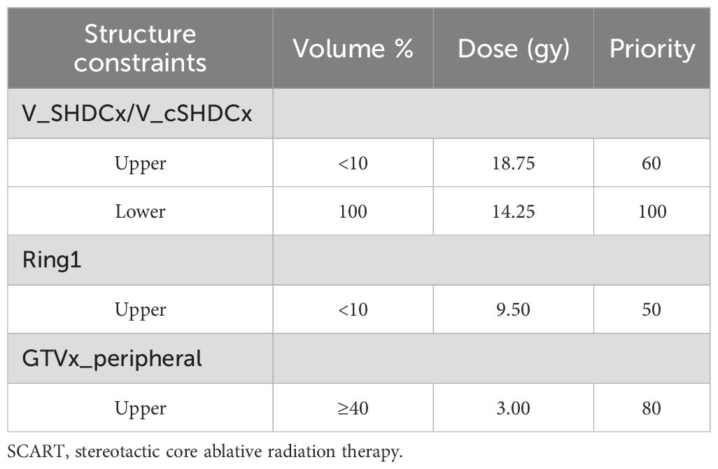 The volume between V_SHDCx and GTVx_central was contoured as Ring1, which was used to control the dose falloff outside the high-dose core (V_SHDCx).