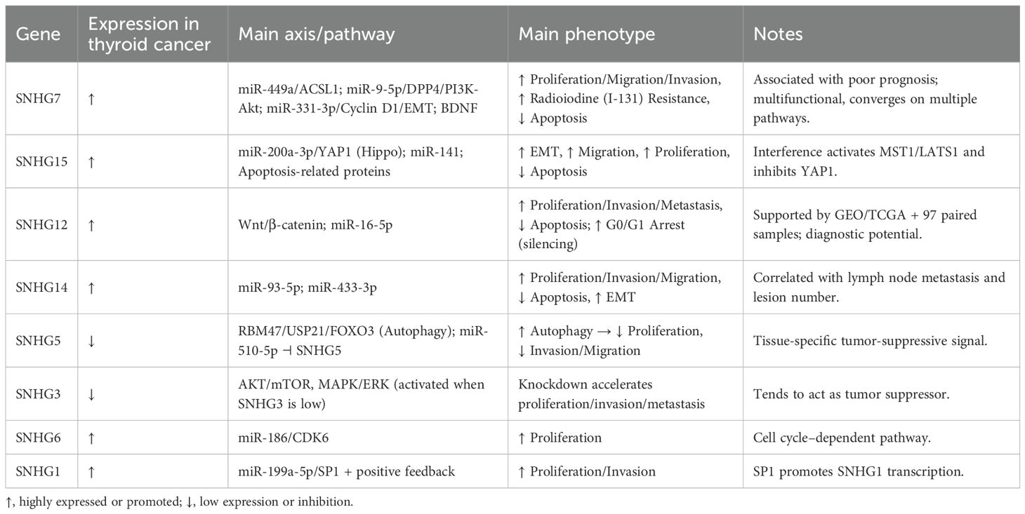 Research by Ding et al. revealed that SNHG12 is highly expressed in thyroid cancer tissues. Silencing SNHG12 inhibits cell cycle progression (G1/G0 arrest), promotes apoptosis, thereby suppressing cell proliferation, and significantly reduces cell invasion and metastasis capabilities. Animal experiments further confirmed that interfering with SNHG12 inhibits tumor cell metastasis to the lungs (34). Mechanistic studies indicate that SNHG12 regulates key molecules in the Wnt/β-catenin signaling pathway, including β-catenin, MMP-2, and Cyclin D1, thereby influencing invasion, metastasis, and proliferation in thyroid cancer cells (34). Given the well-established pivotal role of the Wnt/β-catenin pathway in the development and progression of multiple tumors, this finding suggests that SNHG12 may drive thyroid cancer progression through this pathway(Table 1) (35, 36).