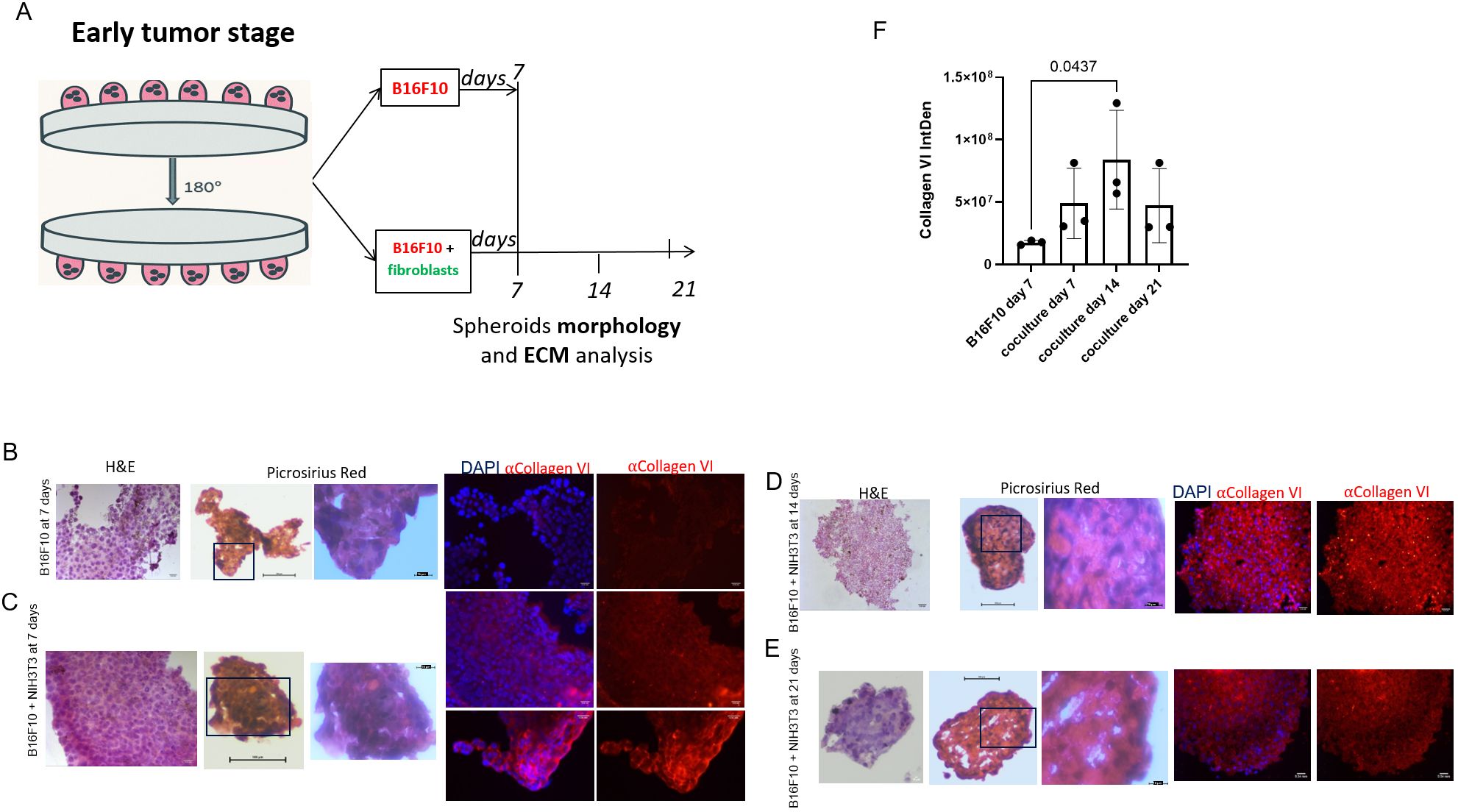 Figure 1. Spheroid generation and ECM deposition. (A) Spheroids were generated by B16F10 cells and by B16F10 and NIH/3T3 cells combination. At days 7, 14 and 21 analyses of morphology and extracellular matrix deposition were executed. ECM deposition has been detected by type-VI collagen deposition in B16F10 spheroids at 7 days (B) and B16F10–NIH/3T3 spheroids at 7 (C), 14 (D), and 21 (E) days, and has been quantified (F). Magnification = 40×. H&E, hematoxylin and eosin. DAPI, 4′,6-diamidino-2-phenylindole. Collagen in spheroids at day 7, 14 and 21 has been analyzed also with Picrosirius Red Staining (B–E).