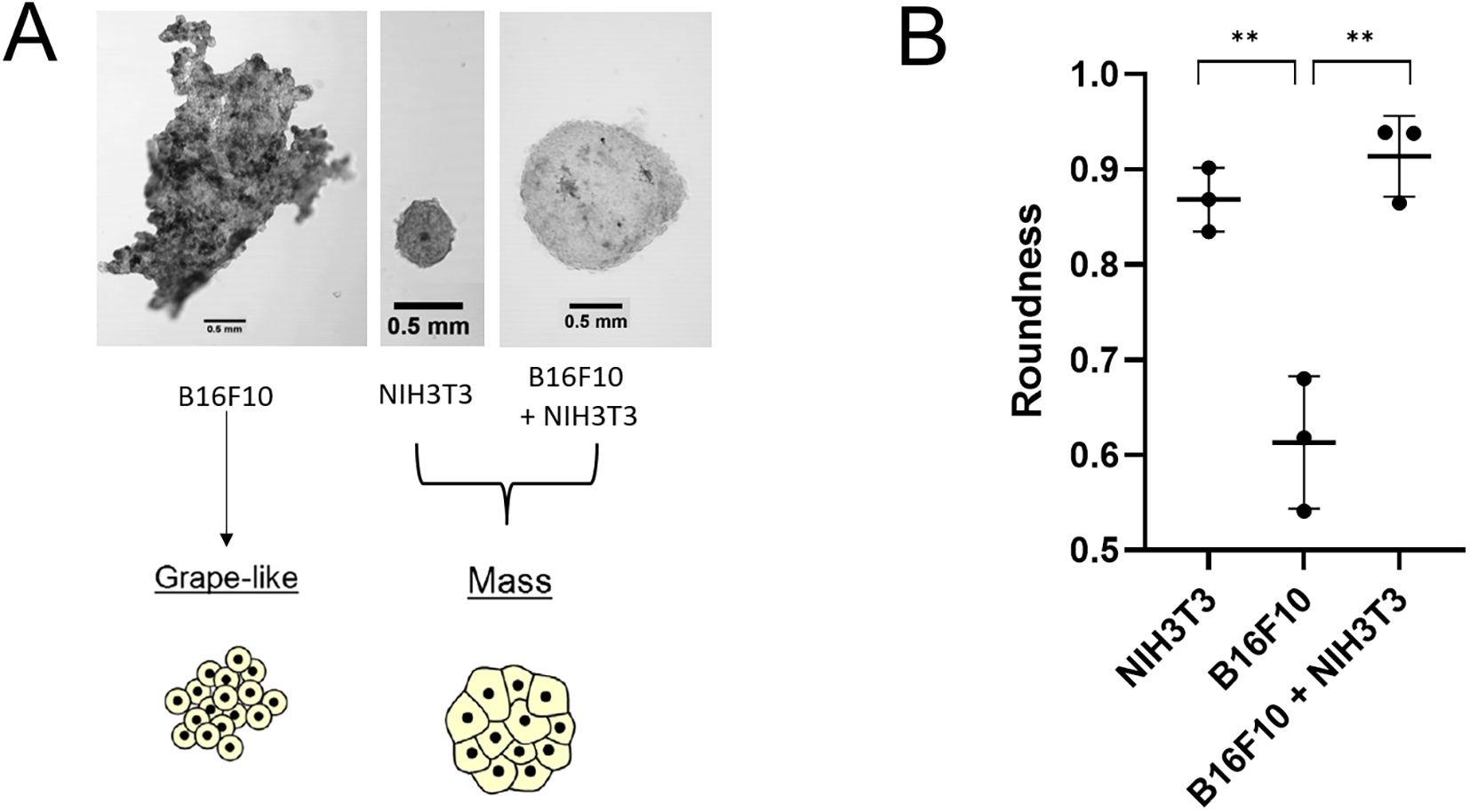 Figure 2. Spheroid morphology. (A) Confocal laser scanning microscopic images of representative spheroids made with B16F10 and/or NIH/3T3 cells on day 7. Magnification = 10×. (B) Spheroid roundness (mean ± standard deviation, n = 9). **p < 0.01 (B16F10 vs. co-culture, p = 0.003).