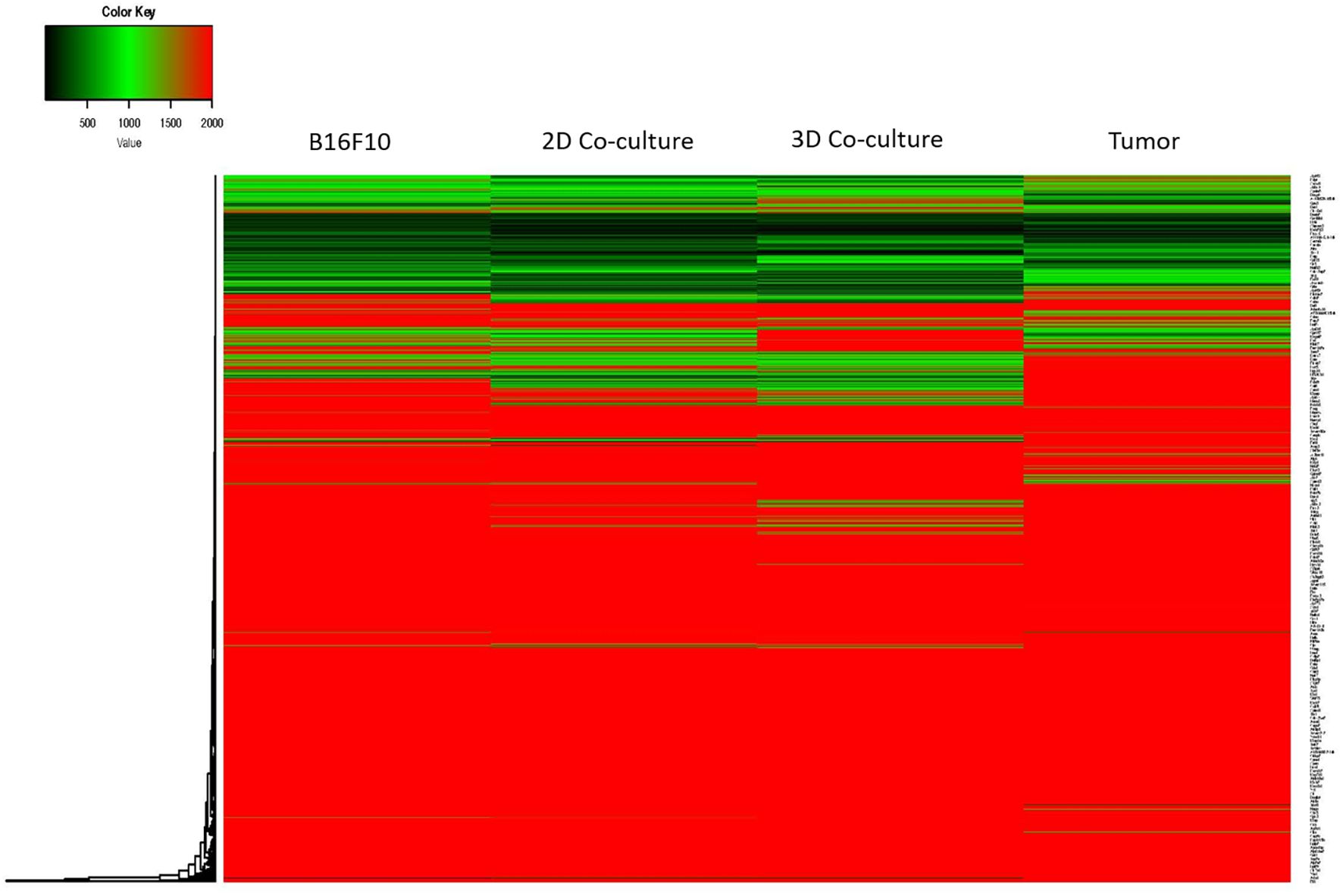 A heatmap comparing gene expression in GFP Linterna™ sorted cells from in-vivo mouse tumor tissue and 2D and 3D co-cultured cell samples with respective control samples was generated using the heatmap.2 tool of the gplots package (version 3.1.1) in R. The average normalized expression across the three B16F10 control conditions was used to generate the heatmap because the NOISeq R package (version 2.34.0) simulates technical replicates for differential expression analysis when an insufficient number of replicates is available, resulting in slight differences among comparisons. Database for Annotation, Visualization, and Integrated Discovery (a web-based tool for gene annotation and the interpretation of biological meaning) Kyoto Encyclopedia of Genes and Genomes pathway analysis was performed using unregulated genes that overlapped only between the mouse tumor and spheroid samples. To identify these genes, we first selected genes with the same expression levels in the spheroids and in vivo model, and then excluded genes with the same expression levels also in the two 2D culture samples. A mean difference (MD) plot (log-intensity ratios vs. log-intensity averages) was generated based on differential expression between GFP B16F10 Linterna™ cells sorted from 3D co-culture with fibroblasts and in-vivo tumors generated from the same cell line.
