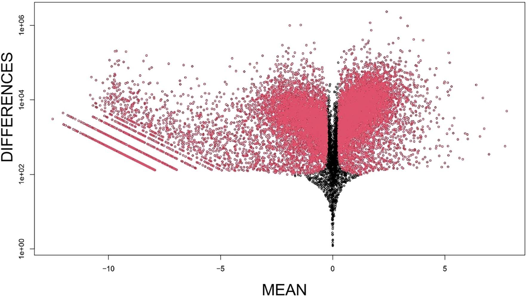 Figure 5. Plot of mean differential gene expression between green fluorescent protein B16F10 LinternaTM cells sorted from three-dimensional co-culture with fibroblasts and in-vivo tumors generated from the same cell line. Black dots, unregulated genes (n = 1780); red dots with negative (positive) x-axis values, genes down-regulated (upregulated) in spheroids relative to tumor samples.