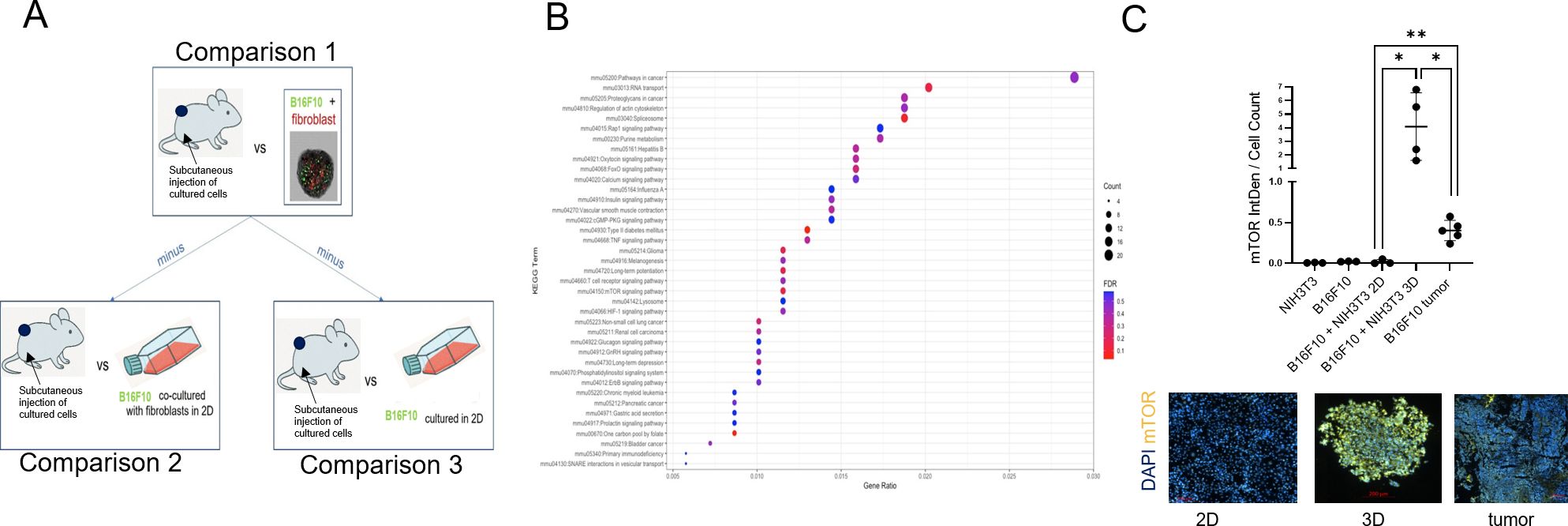 Figure 6. Selection of genes, KEGG pathways analysis and protein validation. (A) For each of the 3 comparisons, the genes having the same expression level were selected, generating 3 lists of genes, one for each comparison. All the genes present in the 2 lists of genes generated from comparisons 2 and 3 were removed from the list of genes generated from the comparison 1, obtaining the exclusive gene signature in common between spheroid and in vivo model. (B) Ratio of the number of genes involved in a pathway to the total of 693 genes. FDR: false discovery rate. (C) mTOR protein IF images representing of 3D co-cultures, 2D co-cultures, monocultures and tumor tissue. mTor in yellow and Dapi in blue. Dot plot shows relative mTOR quantification.