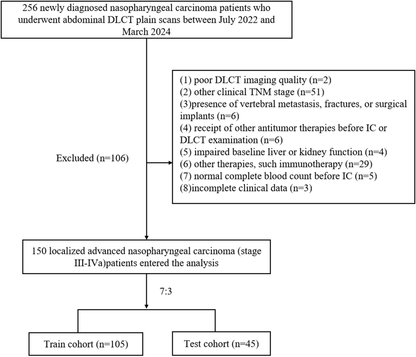 The ethics committee of our hospital approved this study. This was a retrospective study based on routine CT examination and clinical data analysis, so patients’ individual written informed consent was not required. We retrospectively analyzed NPC patients who underwent non-enhanced abdominal DLCT examination in our hospital from July 2022 to March 2024. Inclusion criteria were as follows: (1) age over 18 years; (2) pathologically confirmed LANPC; (3) CT scanning range included all lumbar vertebrae; (4) received at least one cycle of IC, regardless of subsequent concurrent chemoradiotherapy. Exclusion criteria included: (1) poor DLCT imaging quality (n=2); (2) other clinical TNM stage (n=51);(3)presence of vertebral metastasis, fractures, or surgical implants (n=6); (4) receipt of other antitumor therapies before IC or DLCT examination (n=6); (5) impaired baseline liver or kidney function (n=4),defined as alanine aminotransferase or aspartate aminotransferase levels > 40 U/L, and serum creatinine > 106 μmol/L in males or > 97 μmol/L in females, according to our hospital’s laboratory reference ranges; (6) other therapies, such immunotherapy (n=29); (7) normal complete blood count before IC (n=5); or (8) incomplete clinical data (n=3). NPC staging for all patients followed the 8th edition of the American Joint Committee on Cancer TNM staging system. A total of 256 NPC patients were initially screened, and 150 cases were ultimately included (Figure 1).