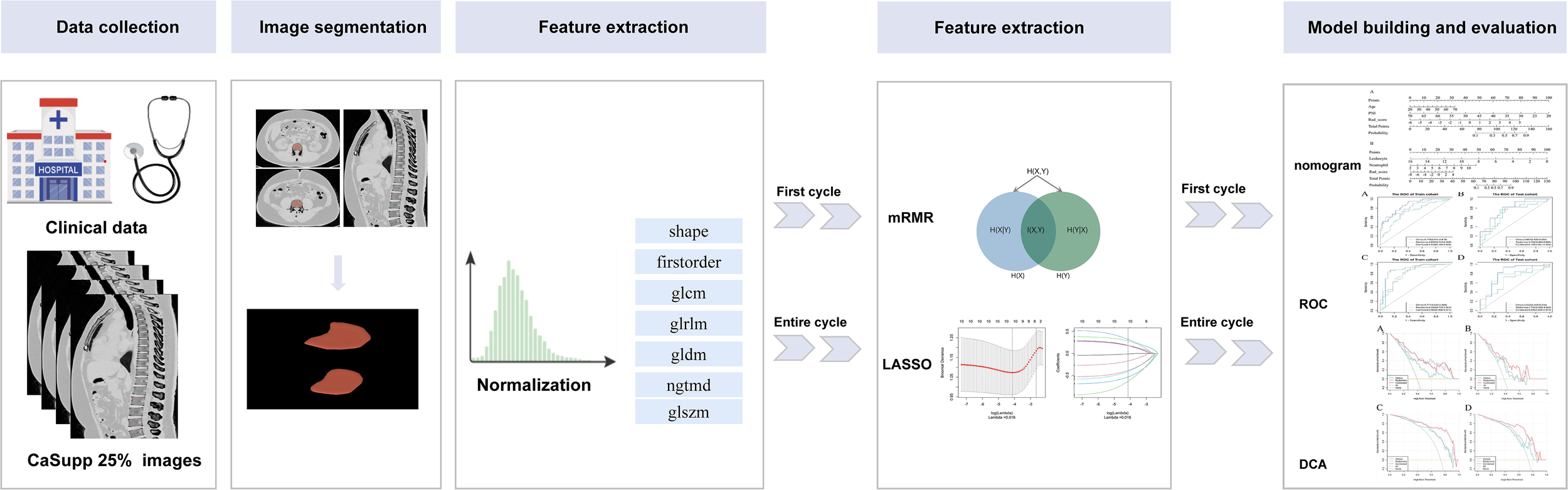 Radiomics features were extracted from ROIs of the two vertebrae in CaSupp-I 25% image, which had an original axial imaging matrix of 512×512. Preprocessing was performed to ensure image comparability, including: (1) resampling images to a voxel size of 1×1×1 mm3; (2) discretizing grayscale values with a bin width of 25 gray levels (26); and (3) normalizing grayscale values across all images to a uniform range of [0,1] using PyRadiomics (normalize = True, normalizeScale = 50), applying a Z‐score transform f(x)=50 (x−μ)/σ to all voxels (27).