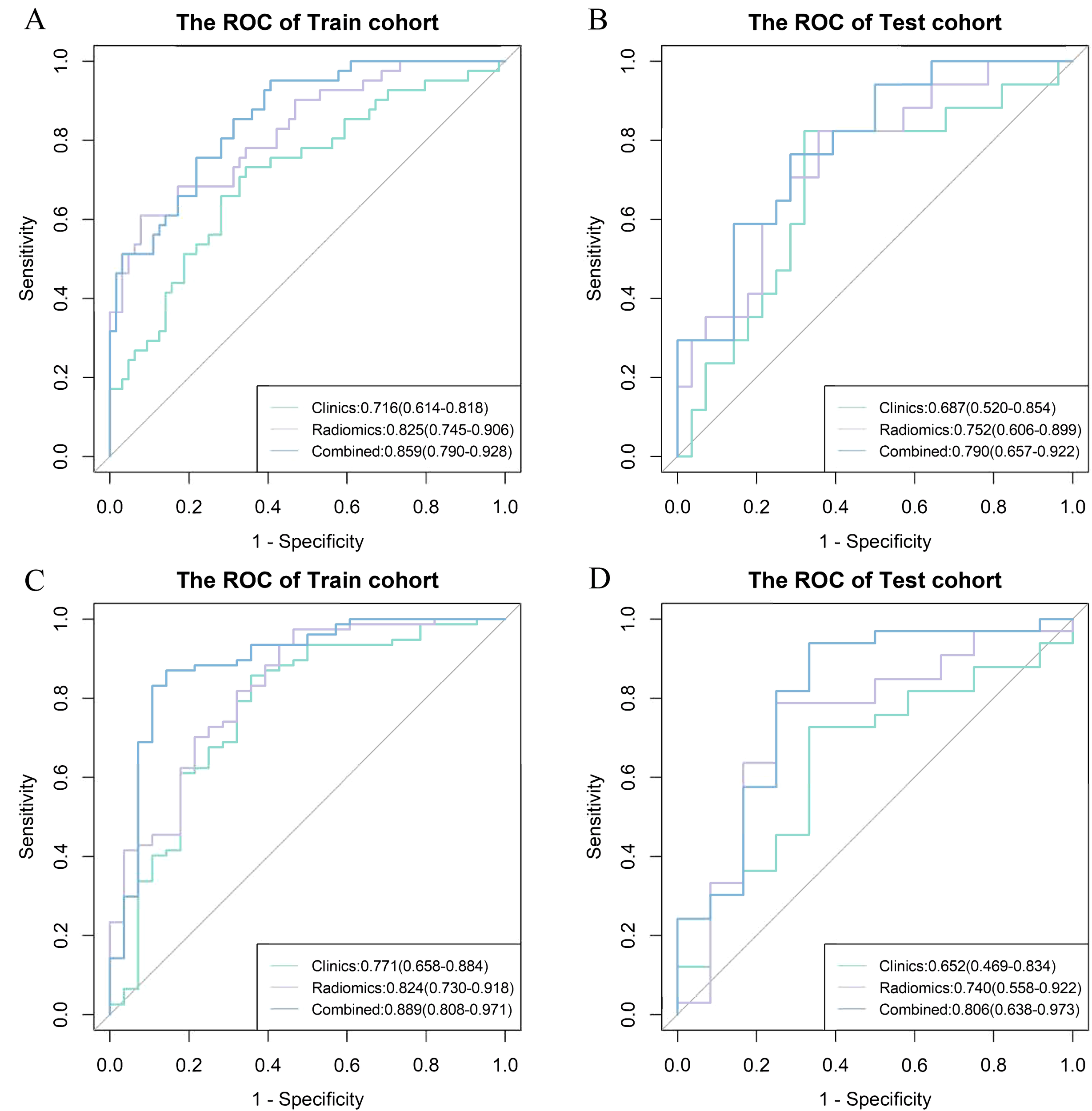For predict myelosuppression after IC - 1, the clinics, radiomics, and combined models had AUC values of 0.716, 0.825 and 0.859 in the train cohort, respectively; and AUC of 0.687, 0.752 and 0.790 in the test cohort, respectively. And for IC-n, the clinics, radiomics, and combined models exhibited AUC values of 0.771, 0.824, and 0.889 in the train cohort, respectively; and AUC of 0.652, 0.740 and 0.806 in the test cohort, respectively. For predicting myelosuppression after both IC - 1 and IC-n,the combined models demonstrated significantly higher AUC values than the clinics models for both IC - 1 and IC-n (all P<0.05).