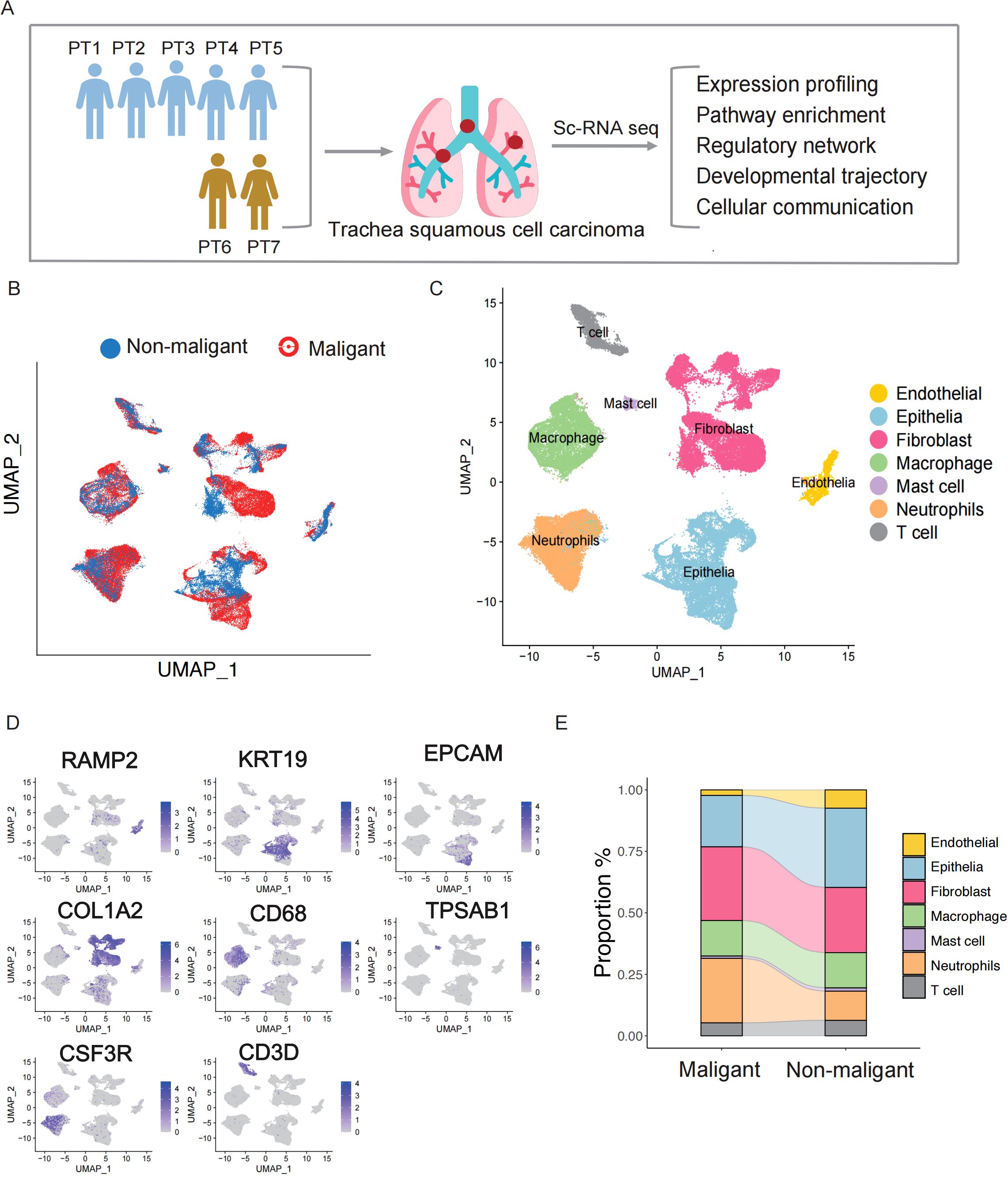 We utilized scRNA-seq to profile seven tissue samples, including five from patients diagnosed with malignant TSCC and two from those diagnosed with non-malignant TSCC. Fresh tissue samples were collected via interventional bronchoscopy, and a customized workflow was used to isolate fresh living single cells primarily from the preprocessed tissue samples. Subsequently, scRNA-seq data analysis was performed to investigate the cell type landscape between malignant and non-malignant samples. The clinical information of these samples is presented in Supplementary Table S1, with patient ages ranging from 46 to 71 years. Of the five patients diagnosed with malignant TSCC, three had received chemotherapy treatment. The seven samples were divided into malignant (PT1, PT2, PT3, PT4, PT5) and non-malignant (PT6, PT7) groups (Figure 1A).