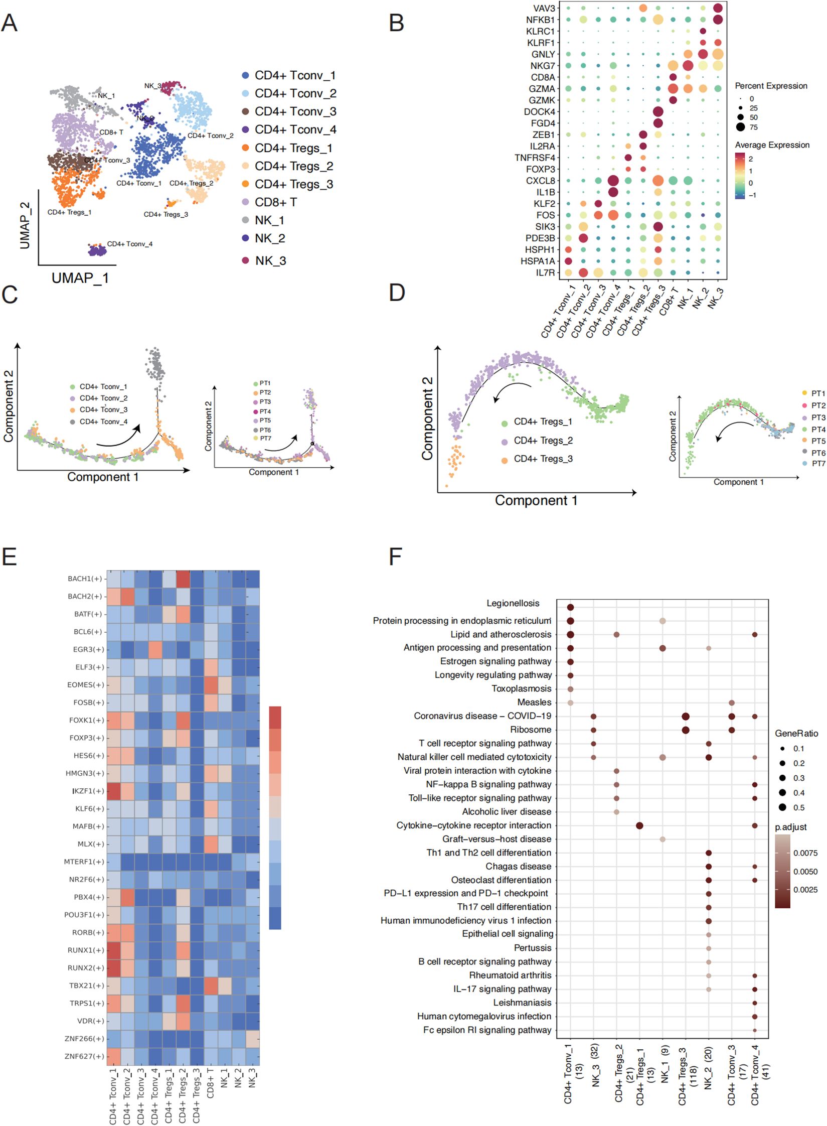 Figure 2. T cell subcluster characteristics and state transition in TSCC. (A) UMAP showing 11 clusters of 17,353 T cells colored by subpopulation. (B) Expression of the marker genes for the indicated cell subtypes. (C) Pseudotime trajectory of CD4+ T conv cell inferred by analysis with Monocle 2 (left) and cells of trajectory colored by sample (right). (D) Pseudotime trajectory of CD4+ T regs cell inferred by analysis with Monocle 2(left) and cells of trajectory colored by sample (right). (E) Heatmap showing the relative regulon activity in each T cell subtypes. The regulon activity is scored using RSS. (F) Comparison of pathway enrichment among different expression genes of T cell subtypes. X axis represents cell type and the number of DEG.
