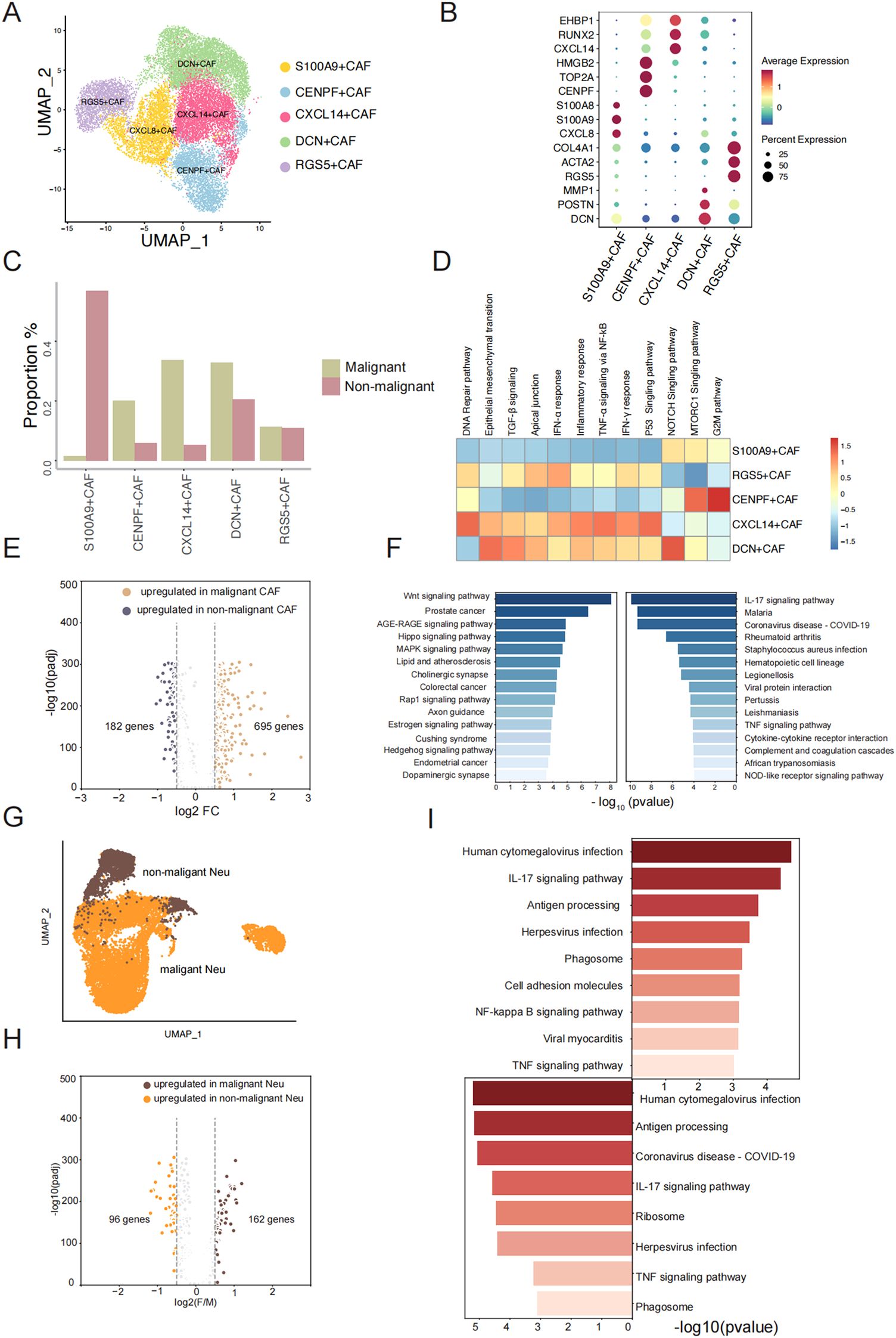Figure 3. Gene expression change of fibroblast and neutrophils between malignant and non-malignant. (A) UMAP plot of fibroblast cells and colored by subtype. (B) The dotplot represents the marker expression of different fibroblast subtypes. (C) The proration of five fibroblast subtypes between two groups. (D) Enrichment pathway of five fibroblast subtypes. (E) Volcano plot showing differential expressed genes between malignant fibroblast cells and non-malignant fibroblast cells. (F) Pathway enrichment analysis of significantly upregulated genes (left: malignant sample, right: non-malignant sample). (G) UMAP plot of Neutrophil cells and colored by sample type. (H) Volcano plot showing differential expressed genes between malignant Neutrophil cells and non-malignant Neutrophil cells. (I) Top enrichment Pathway of significantly upregulated genes of malignant Neutrophil cells and non-malignant Neutrophil cells (left: malignant sample, right: non-malignant sample).