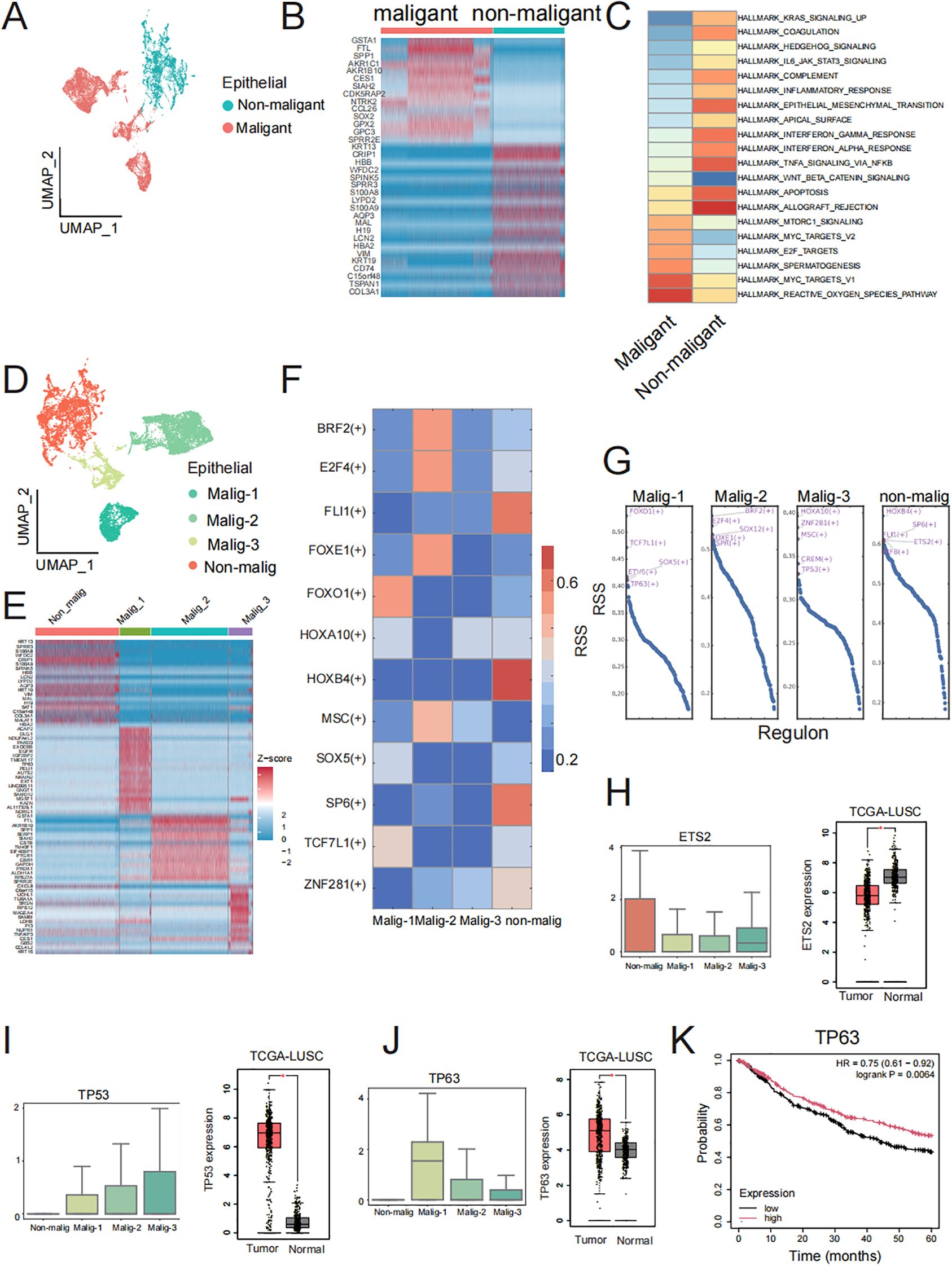 Figure 4. Malignant and non-malignant heterogeneity of cancer cells. (A) UMAP visualization of malignant and non-malignant epithelial cell groups. (B) Top 30 DEGs in malignant and non-malignant epithelial cell groups. (C) Heatmap of GSVA of the 50 hallmark gene sets in the MSigDB database between Malignant and non-malignant epithelial cells. (D) UMAP visualization of non-malignant and three malignant epithelial cell subclusters. (E) Top 30 DEGs in non-malignant and three malignant subclusters cancer cell. (F) Specific TF regulons identified in non-malignant and three malignant subclusters. Color key from blue to red represents the RSS scores from low to high. (G) Transcription factors were sorted by RSS value in non-malignant and three malignant epithelial cell subclusters. Top five transcription factor of each subclusters were labeled by red font. (H, J) Boxplot of ETS2, TP63 and TP53 gene expression in non-malignant and three malignant epithelial cell subclusters and boxplot of ETS2, TP63 and TP53 gene expression in TCGA-LUSC dataset. The three genes were specific transcription factors in non-malignant, malig-1, and malig-3 respectively, along with DEGs in corresponding clusters. (K) Prognostic analysis of TP63 expression levels (high vs low) on overall survival in TCGA-LUSC patients.