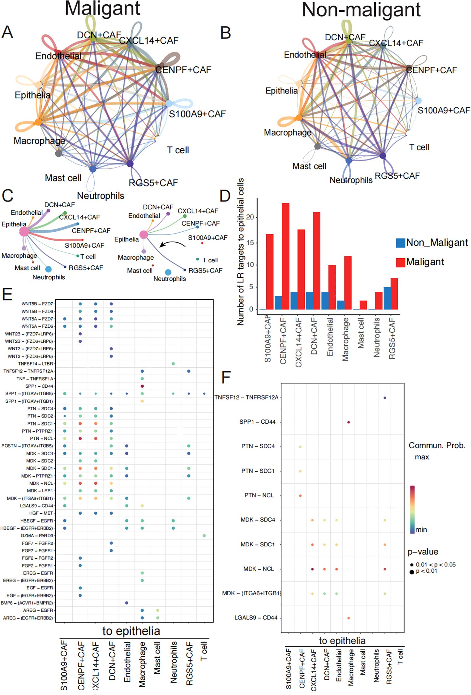 Figure 5. Communication analysis exhibits malignant-specific ligand–receptor interactions. (A) Communication between cells within a major cell type in malignant samples colored by cell subtypes. Two cell populations are represented by the size of their flow, which represents the number of ligand-receptor pairs. (B) Cell-cell communications within major cell type in non-malignant samples. (C) Detailed view of the ligands-receptor pairs sender from stromal cells and immune cells to epithelia in two groups. The width of line represents the number of ligands-receptor pairs. (D) The number of ligand-receptors pairs from stromal cells and immune cells to epithelia cells between malignant and non-malignant samples. (E) The dot plot generated by CellChat demonstrates potential ligand-receptor pairs in malignant group. The colored dots represent communication probability, while the size of the dots represents the P Value. (F) The dot plot generated by CellChat demonstrates potential ligand-receptor pairs in non-malignant group.