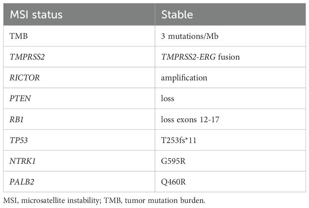 A 64-year-old man with a prostate-specific antigen (PSA) level of 8.61 ng/mL and no relevant medical history underwent a prostate biopsy, which led to a diagnosis of adenocarcinoma (Gleason score 4 + 4), classified as cT2aN0M0 (Figure 1). A laparoscopic radical prostatectomy was performed, and histopathology revealed adenocarcinoma (Gleason score 4 + 5), pT3bNxMx, with positive resection margins (Figure 2A). However, 4 months postoperatively, the serum PSA increased from a postoperative nadir of 0.82 ng/mL to 6.48 ng/mL, and computed tomography (CT) revealed a local recurrence mass and metastasis in the liver, bones, and retroperitoneal area. The patient was initiated on androgen deprivation therapy (ADT) with leuprolide acetate and bicalutamide. Although the serum PSA level of the patient decreased, CT showed tumor enlargement.