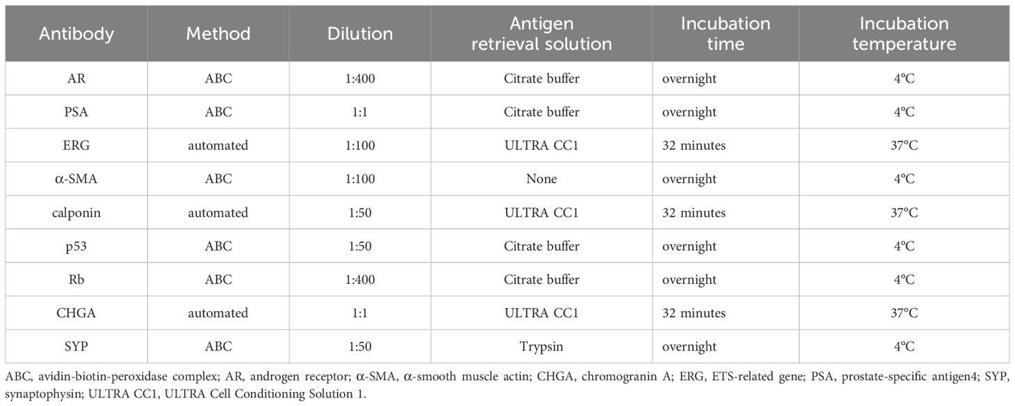 Immunohistochemistry staining was performed on formalin-fixed, paraffin-embedded tissues using primary antibodies for AR (5153, Cell Signaling Technology, Danvers, MA), PSA (IS 514, Dako, Carpinteria, CA), ERG (ab92513, Abcam, Cambridge, UK), α-SMA (M0851, DAKO), calponin (M3556, DAKO), p53 (NCL-L-p53-DO7, Leica Biosystems, Buffalo Grove, IL), Rb (ab25124, Abcam), chromogranin A (LK2H10, Roche, Indianapolis, IN), and synaptophysin (A0010, DAKO). Immunohistochemical staining for AR, PSA, α-SMA, p53, Rb, and synaptophysin was performed using the avidin-biotin-peroxidase complex method, with biotinylated anti-mouse IgG antibody (dilution at 1:300; BA-2000-1.5, Vector Laboratories, Burlingame, CA, USA) and biotinylated anti-rabbit IgG antibody (dilution at 1:300; BA-1000-1.5, Vector Laboratories). Staining for ERG, calponin, and chromogranin A was automatically performed using the BenchMark ULTRA PLUS system (Roche). For antigen retrieval, citrate buffer (pH 6.0), trypsin (pH 7.5), or ULTRA Cell Conditioning Solution 1 (pH 8.5, 950-224, Roche) was used, as appropriate for each antibody. External positive control slides were not used except for Rb, as immunostaining for AR, PSA, ERG, α-SMA, calponin, p53, chromogranin A, and synaptophysin was performed using well-established protocols that have consistently produced reliable and reproducible results. Human spleen tissue was used as the external positive control for Rb immunohistochemical staining. Table 2 summarizes the specific immunohistochemical staining conditions for each antibody.