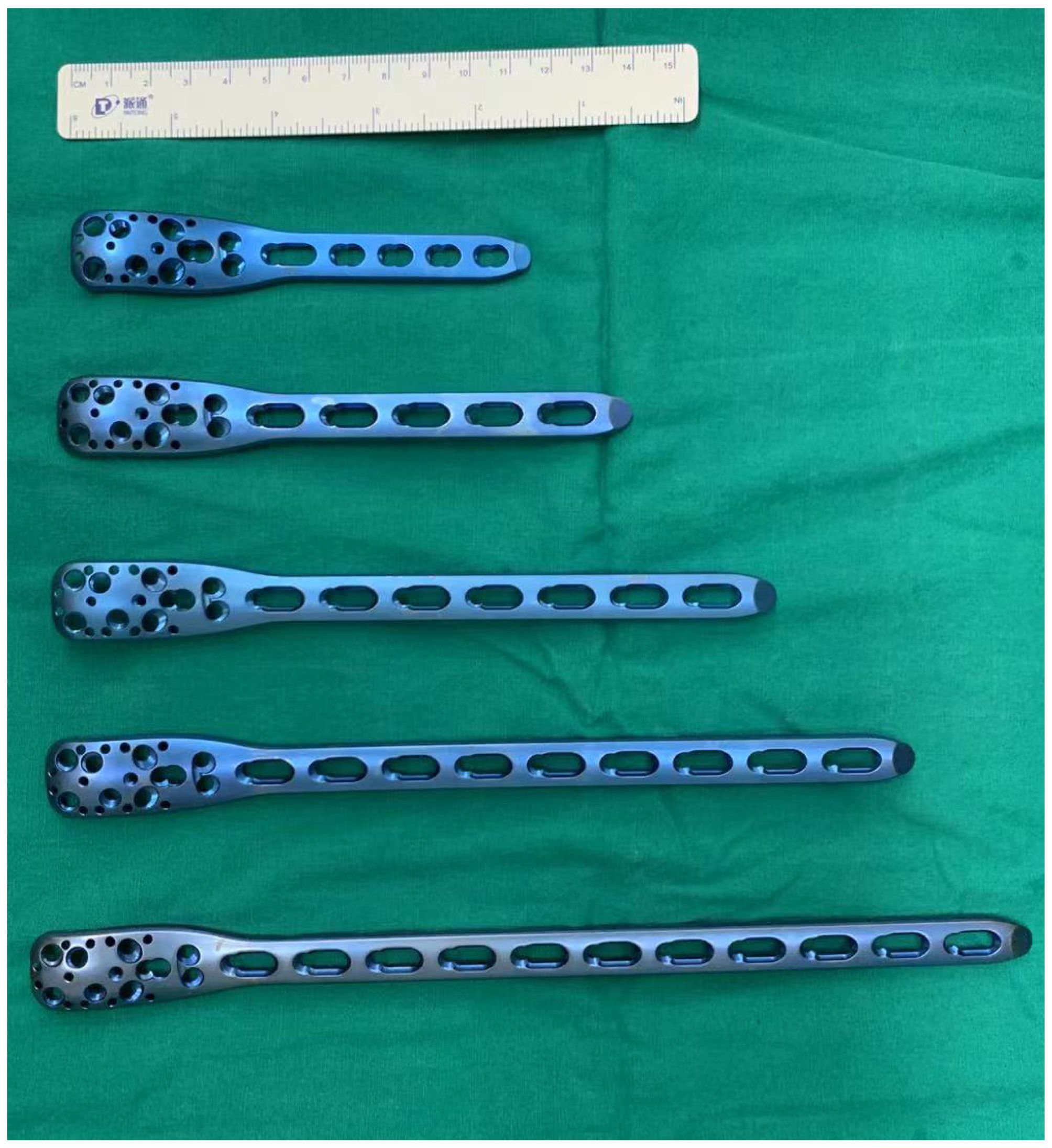 There are several advantages to this surgical approach. First, the multiple lengths of locking plates provide more stable fixation and an optimal environment for bone healing. Second, the multiple locking holes at the proximal end of the humeral locking plate allow us to select the optimal locking hole and locking angle for the specific situation during the procedure, which is the most significant advantage over other devices. In addition, the size of the locking plate and the diameter of the locking screws are suitable for proximal femoral fixation in young pediatric patients.