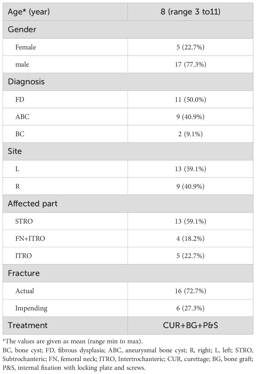 The duration of follow-up for patients (n=22) in this study ranged from 27 to 118 months (Table 1). Patients included 17 males aged 3 to 11 years and 5 females aged 4 to 11 years (Table 1). Patients with impending fractures (n = 6) had painful lesions with cortical erosion. Patients with actual pathologic fractures (n = 16) had mild-to-moderate displacement and angulation. Imaging and needle biopsy or intraoperative frozen biopsy were also taken to determine the types of lesions.