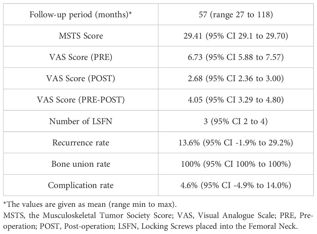Even in patients with benign lesions, pathologic fractures of the proximal femur that are imminent or have occurred can cause moderate-to-severe pain and loss of walking function. Effective surgical intervention includes good scraping, bone grafting, and stable fixation. In young pediatric patients with pathologic fractures of the proximal femur, the primary goals of fixation are to reduce pain, maintain fracture stability, maintain the lower limb force line, and promote bone graft healing. In addition, prevention of re-fracture and early weight-bearing is important in young pediatric patients. In the present study, the mean pain relief in patients with actual pathological fractures assessed by VAS score was 4.88 (95% CI, 4,30 to 5.45) (P<0.05). The mean total MSTS score (measured during the second-year postoperative follow-up) for the entire group of patients was 29.41 (95% CI, 29.11 to 29.70) (Table 2).