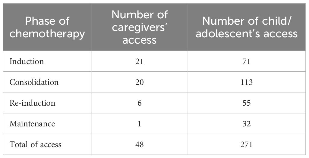 Table 1. Total number of accesses recorded for caregivers and children/adolescents across the different phases of chemotherapy.