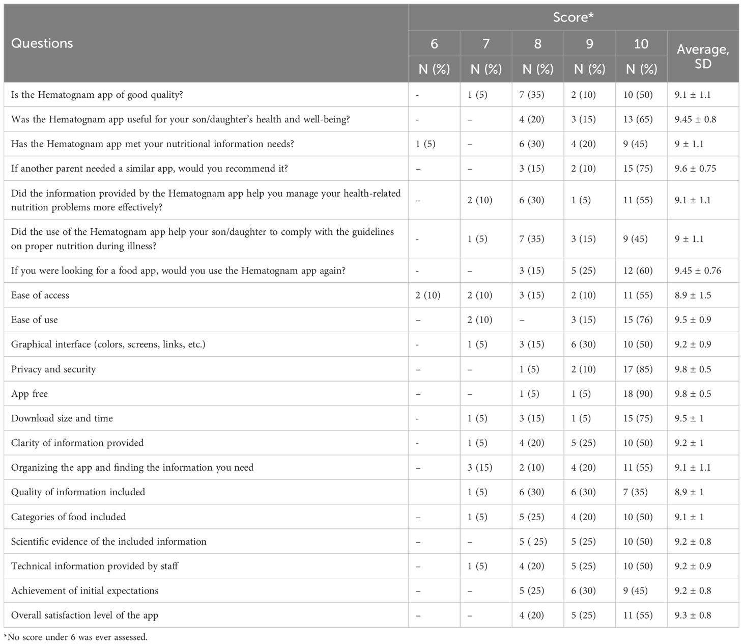 The study was designed as observational, non-pharmacological, monocentric. The app was developed following a thorough literature review focused on the nutritional needs of children and adolescents undergoing chemotherapy. The app provided caregivers with nutritional recommendations tailored to the different treatment stages (induction, consolidation, reinduction, and maintenance). After minimum three months and maximum four months of app use, families were asked to evaluate the usability and effectiveness of the app through an anonymous questionnaire distributed and collected by a member of the research team. No formal sample size calculation was performed, as the study was designed as an exploratory feasibility and usability assessment. A total of 20 families (20 pediatric patients and 20 parents/caregivers) was included, corresponding to the consecutive eligible cases during the recruitment period. Prior usability research suggest that 15–20 participants per user group are sufficient to detect the majority of major usability problems (15, 16). Furthermore, with 20 participants per group, the precision of quantitative usability measures is acceptable: assuming a standard deviation of approximately 12.5 on the System Usability Scale (SUS), a sample of 20 yields a 95% confidence interval with a half-width of about 5.5 points, which is adequate for a pilot study (17).