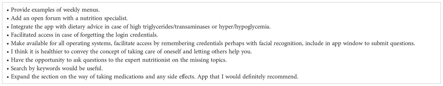 Despite the app’s high usability scores, several areas for improvement were identified. For instance, caregivers reported difficulties with accessing the app due to forgotten credentials and requested a more streamlined login process such as facial recognition or fingerprint. There was also a demand for additional features, such as the ability to consult a nutrition expert directly through the app, adding weekly meal plans, supporting all operating systems. In Table 3 are summarized the caregivers’ comments and advice for improvement.
